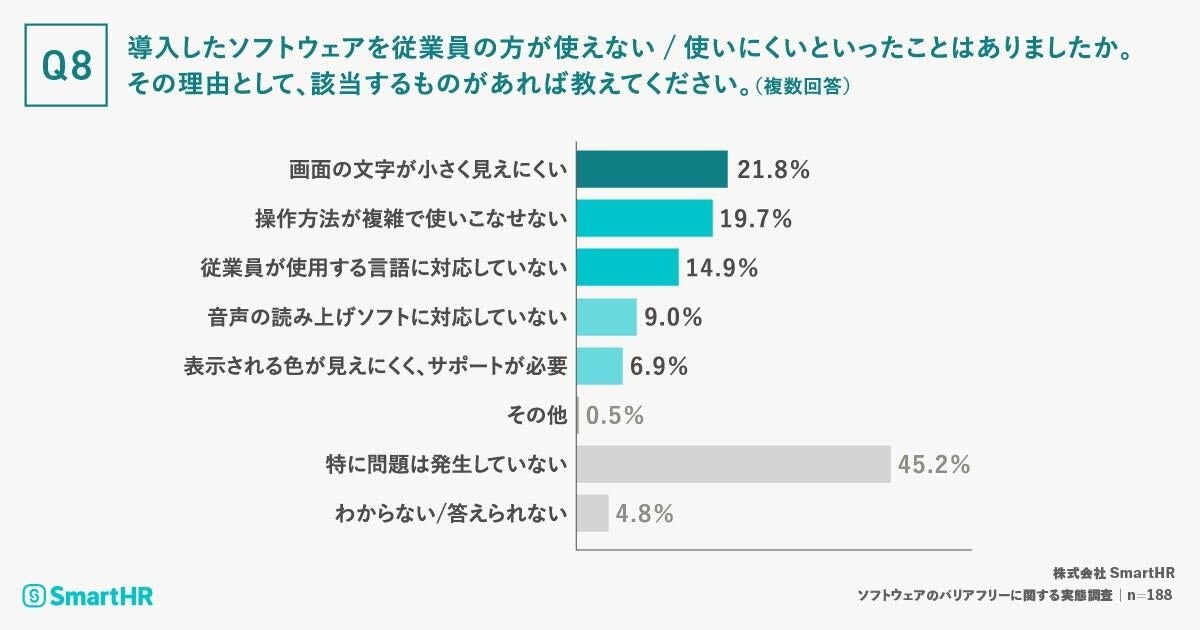 (6)で「あまり考慮していない」「全く考慮していない」と回答した方に、「導入したソフトウェアを従業員の方が使えない/使いにくいといったことはありましたか。その理由として、該当するものがあれば教えてください。(複数回答)」と質問したところ、「画面の文字が小さく見えにくい」が21.8%、「操作方法が複雑で使いこなせない」が19.7%、「従業員が使用する言語に対応していない」が14.9%という回答となりました。