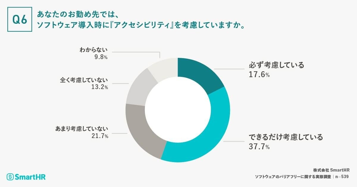 「あなたのお勤め先では、ソフトウェア導入時に『アクセシビリティ』を考慮していますか。」と質問したところ、「必ず考慮している」が17.6%、「できるだけ考慮している」が37.7%という回答となりました。