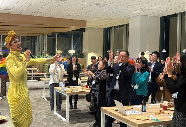 後半の交流会では、軽食とドリンクを囲みながら、参加者同士がリラックスした雰囲気の中で交流を深めました。ゲーム企画として、LGBTQ+に関する理解促進を目的としたクイズを実施し、チーム形式での参加を通じて、企業・業種・立場を超えたコミュニケーションが活発に行われました。また、ゲストであるドラァグクイーンのドリアン・ロロブリジーダさんによる歌のサプライズ企画も実施。会場を盛り上げるとともに、参加者一人ひとりに力強いエールが送られました。