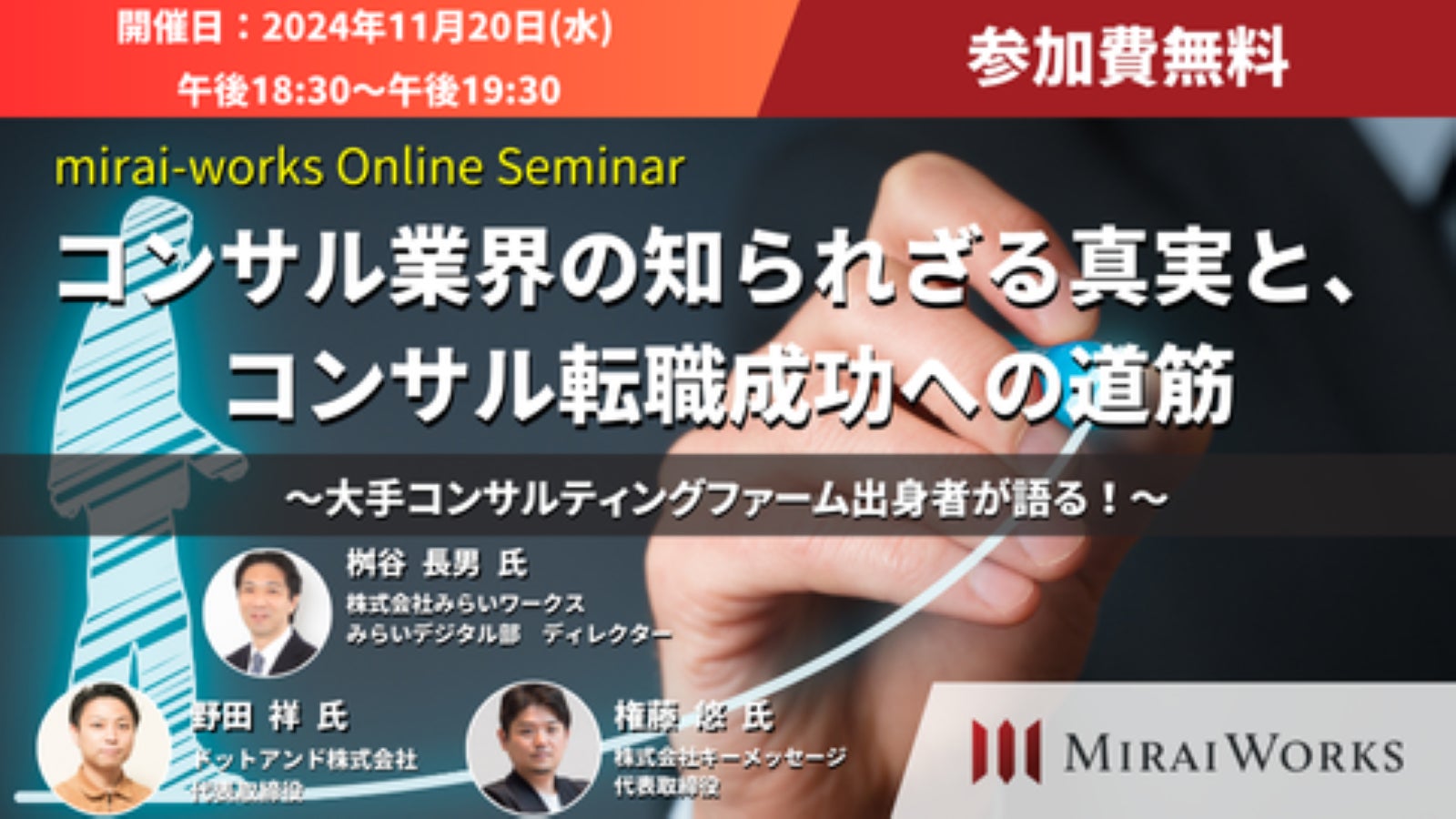 株式会社みらいワークス(本社:東京都港区、代表取締役社長 岡本 祥治、以下「当社」)は、2024年11月20日(水)に「コンサルティング業界や転職」における、対談形式でのオンラインセミナーを開催します。