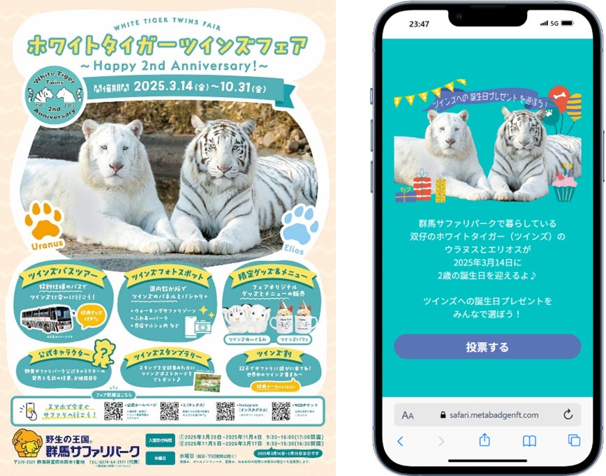 また、2025年2月20日(木)より「ホワイトタイガーツインズフェア ~Happy 2nd Anniversary!~ 先行キャンペーン」を実施しています。今後も群馬サファリパークを好きなユーザーに対し、Metabadgeを活用した参加型の企画を行っていくことで、顧客満足度の向上を推進してまいります。