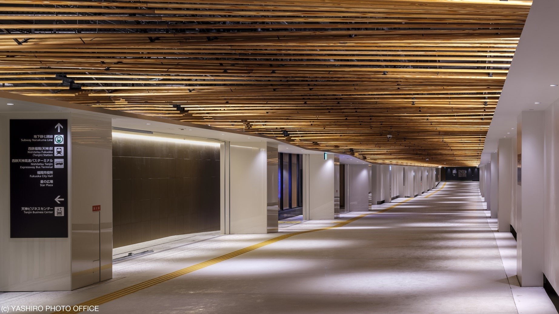 本地下通路は、天神一丁目交差点と福岡市役所西交差点を結ぶ因幡町通りの地下に整備するものです。地下鉄天神駅や福岡市役所市庁舎地下通路をはじめ天神ビジネスセンターにも接続します。天井には不燃木ルーバーを用いてぬくもりのある空間をつくり、天神に新たな地下空間を創出します。隣接する周辺施設をバリアフリー動線でつなぐことで誰もが快適に利用できるようにするとともに、地下の歩行者ネットワークの強化に取り組むものです。