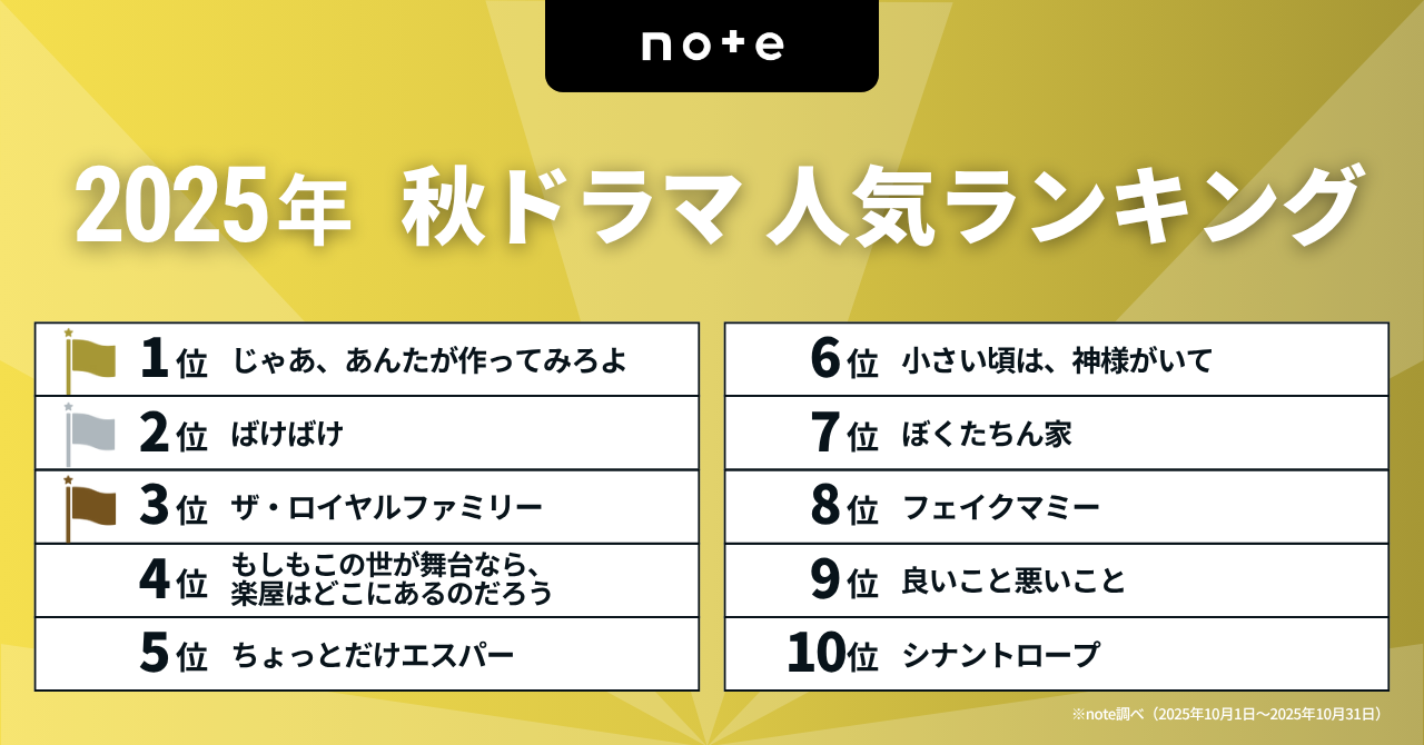 noteで話題になった2025年秋クールドラマのランキングを発表しました。夏帆さん、竹内涼真さんがW主演を務めるTBSの火曜ドラマ『じゃあ、あんたが作ってみろよ』が第1位に輝きました。以下、ランキングの詳細です。