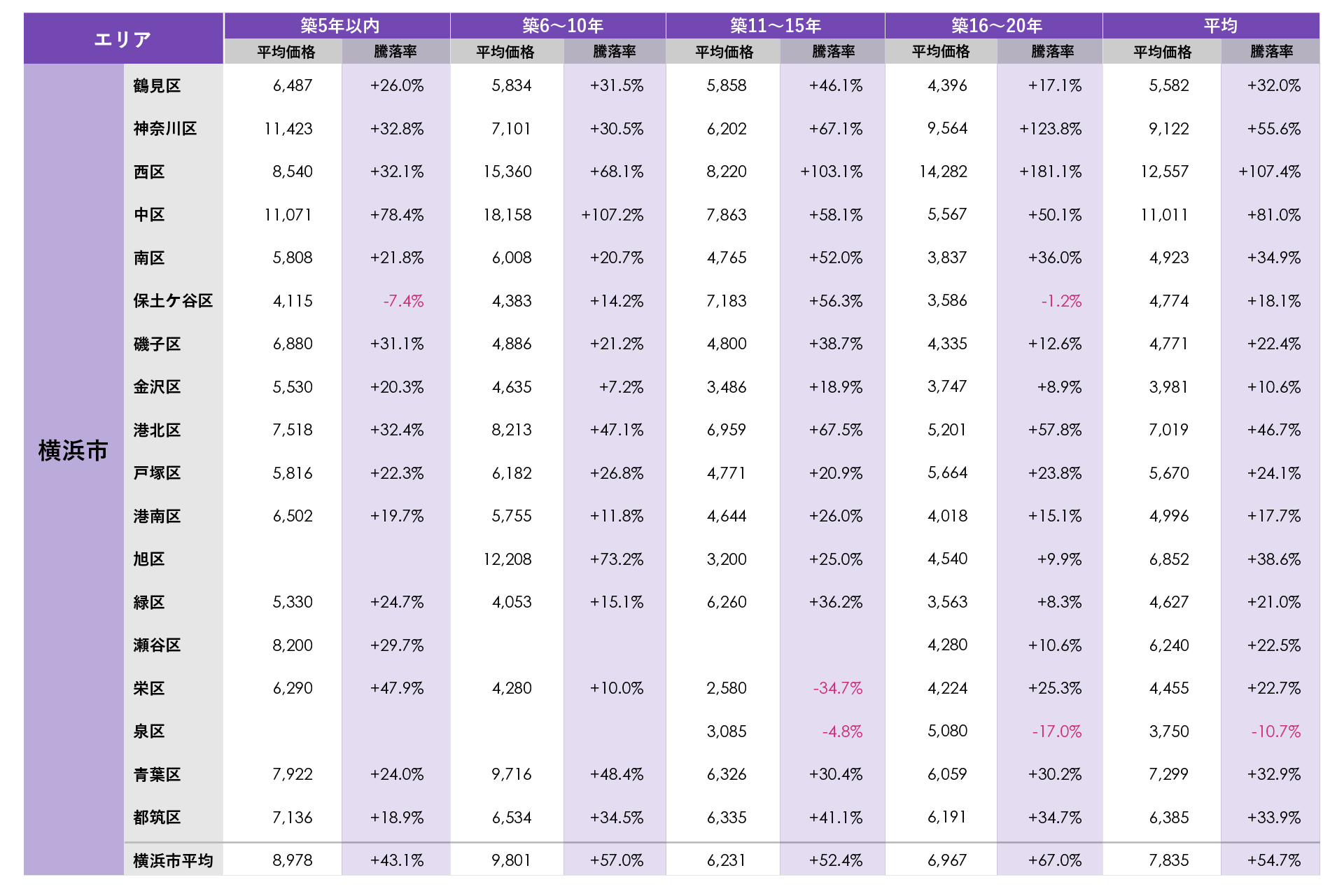 横浜市では、西区と中区の平均価格が1億円を上回りました。平均騰落率は西区が最も高く新築分譲時プラス107.4%(新築時価格の約2.1倍)で唯一100%(新築時価格の2倍)を上回りました。築年数別では神奈川区の築5年以内、西区の築6~10年、築16~20年、中区の築5年以内、築6~10年で平均価格が1億円を上回りました。築年数別の平均騰落率では西区の築16~20年のプラス181.1%(新築時価格の約2.8倍)が最も高く、その他西区の築11~15年、神奈川区の築16~20年、中区の築6~10年で平均騰落率がプラス100%(新築時価格の2倍)を超えました。引き続き横浜駅周辺のタワーマンションが中古流通価格をけん引しています。