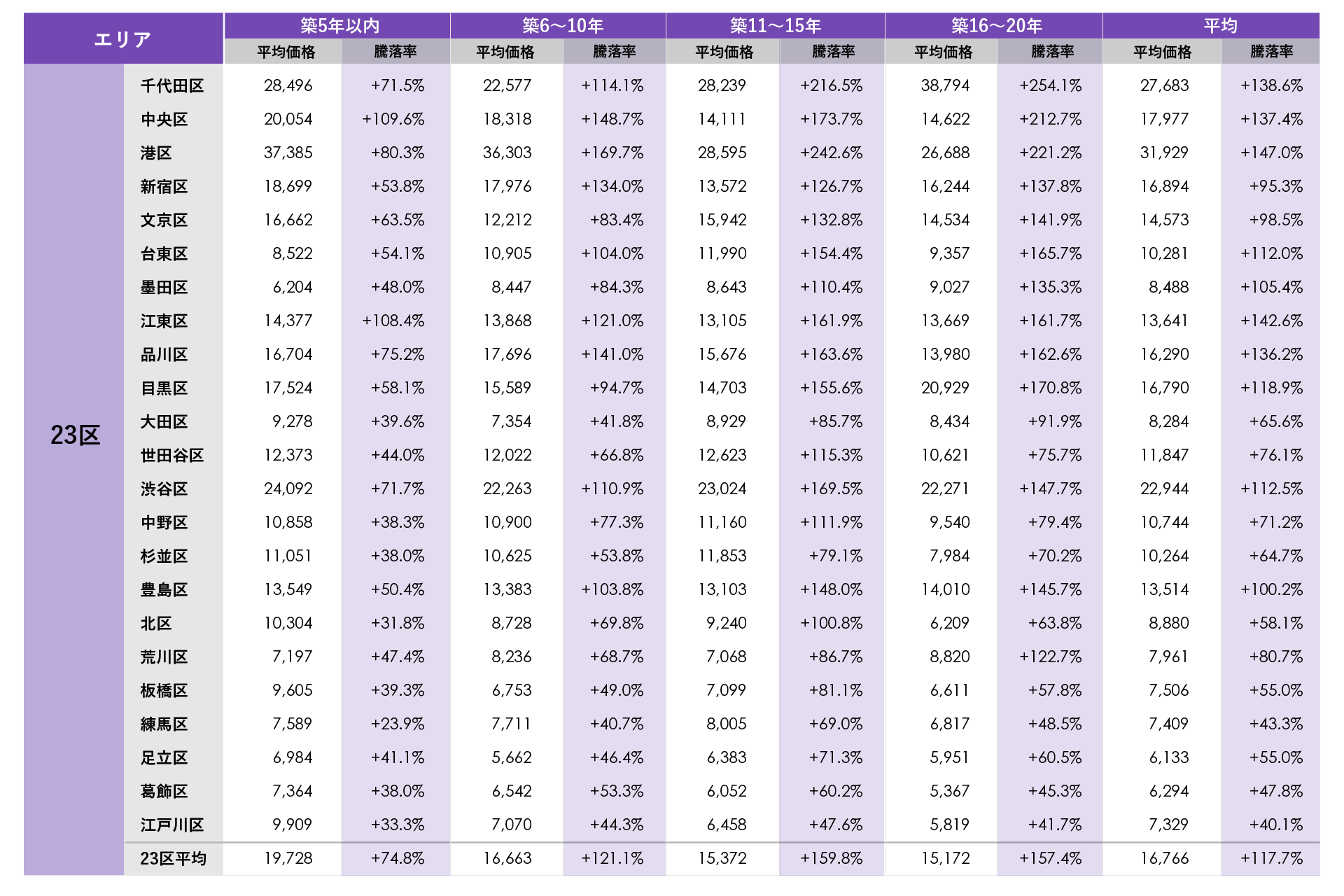 東京23区では、千代田区、中央区、港区、新宿区、文京区、台東区、江東区、品川区、目黒区、世田谷区、渋谷区、中野区、杉並区、豊島区の14区で平均価格が1億円を超えました。平均騰落率が最も高かった港区では新築分譲時プラス147.0%(新築時価格の約2.5倍)、2番目に高かった千代田区でも平均騰落率がプラス138.6%(新築時価格の約2.4倍)となり、計10区が100%(新築時価格の2倍)以上の平均騰落率となりました。築年数別で特に騰落率が高いのは千代田区の築11~15年、築16~20年、中央区の築16~20年、港区の築11~15年、築16~20年で平均騰落率がプラス200%(新築時価格の3倍)を上回りました。