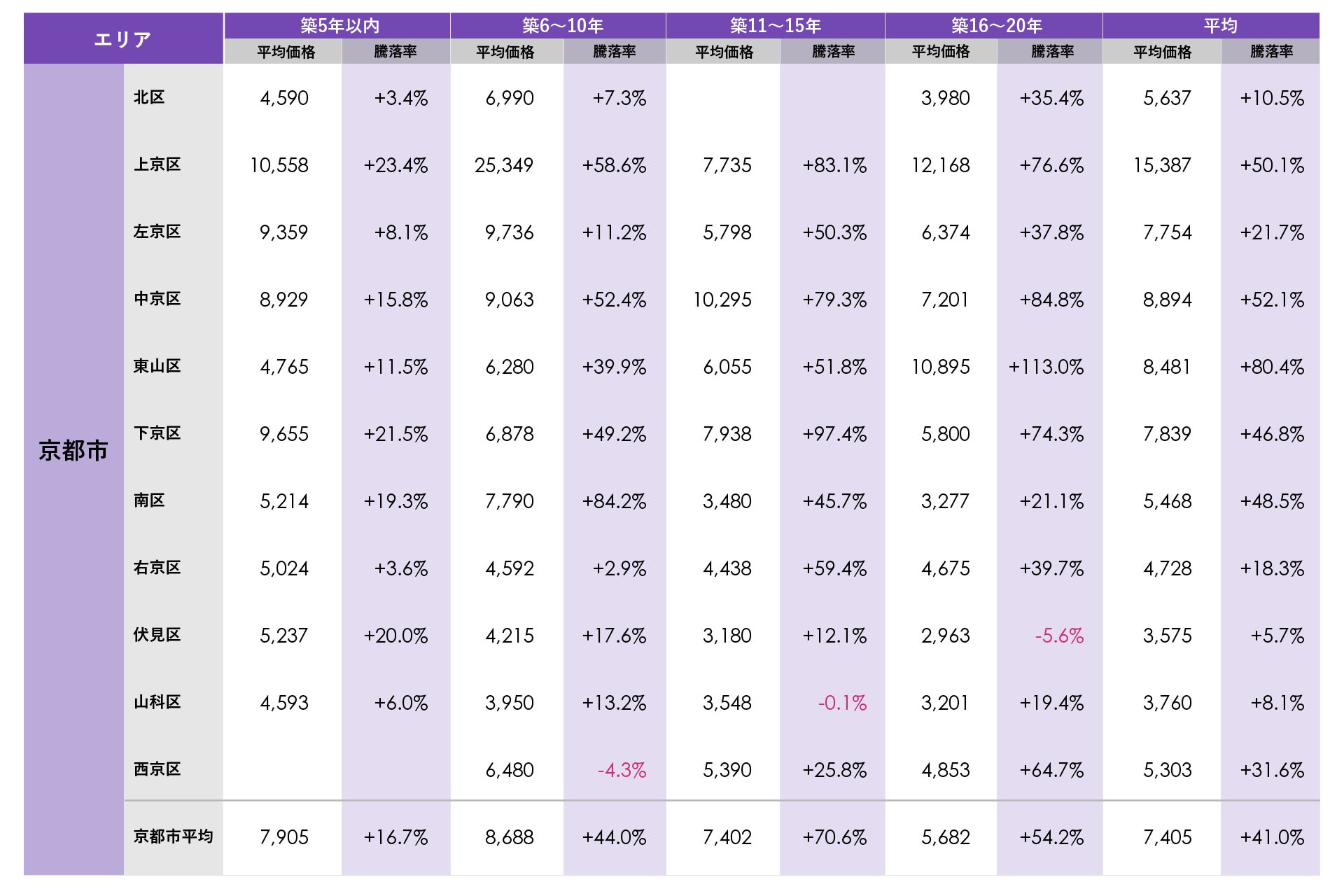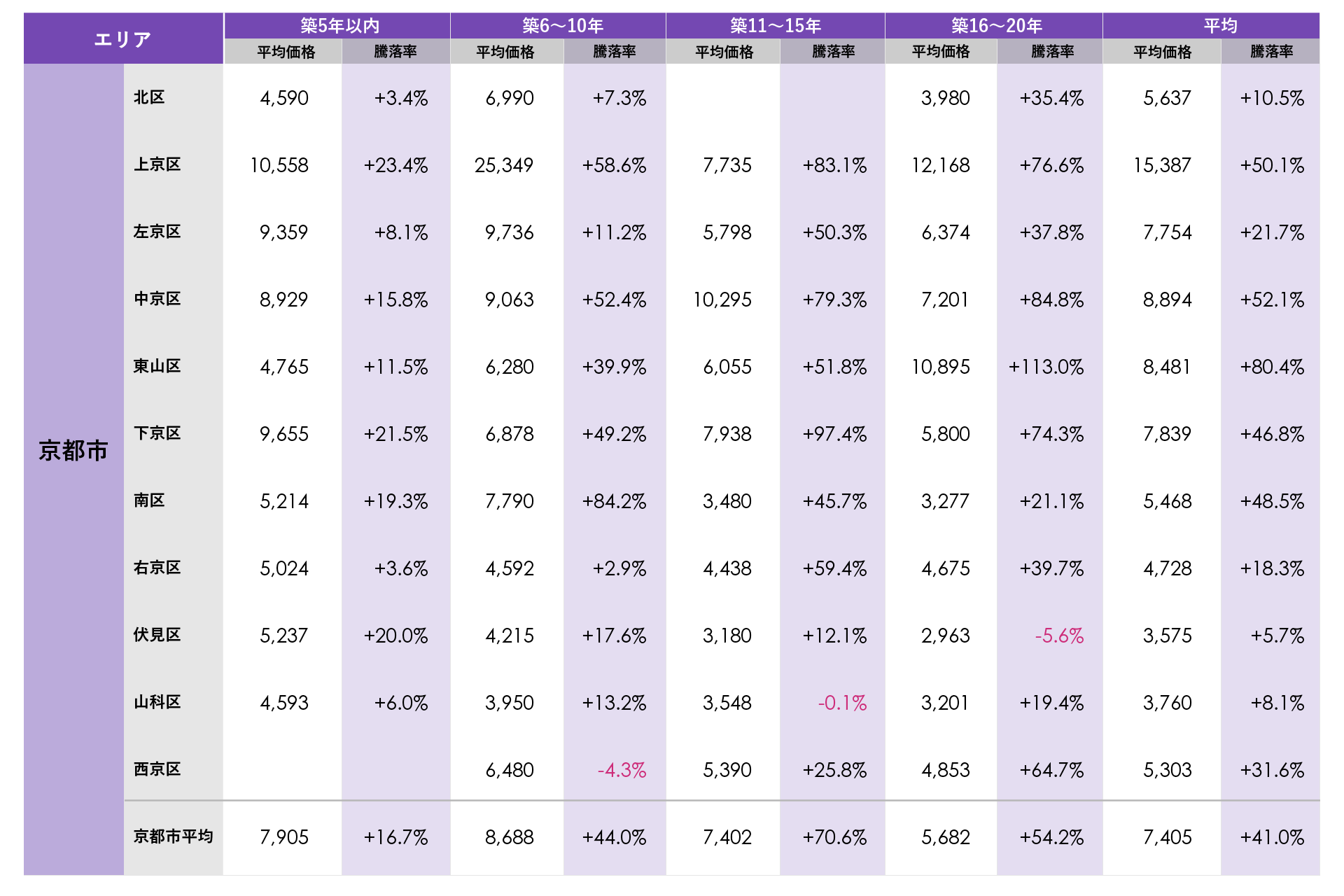 京都市で平均価格が最も高かったのは上京区の1億5,387万円で、市内で唯一平均価格が1億円を上回りました。10億円を上回る住戸が流通するなど高額物件が価格高騰をけん引しています。平均騰落率が最も高かったのは東山区の新築分譲時プラス80.4%で最も高く、その他上位エリアでも50%(新築時価格の1.5倍)前後の騰落率となりました。築年数別では東山区の築16~20年のプラス113.0%(新築時価格の2.1倍)が唯一、平均騰落率プラス100%(新築時価格の2倍)を上回りました。リーマンショック前に東山駅最寄りで供給された物件の価格上昇が要因になっています。