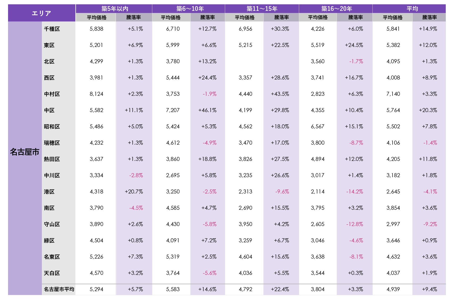 名古屋市で平均価格が最も高かったのは中村区の7,140万円で、平均価格が6,000万円を上回ったのは中村区のみでした。平均騰落率が最も高かったのは中区で新築分譲時プラス20.3%となりました。名古屋市では、平均騰落率がプラス10%を超えたのは千種区、東区、中区、熱田区の4区、その他は9区がプラス1ケタ台、3区がマイナスとなりました。築年数別で最も平均騰落率が高かったのは、中区の築6~10年でプラス46.1%(新築時価格の約1.5倍)でした。