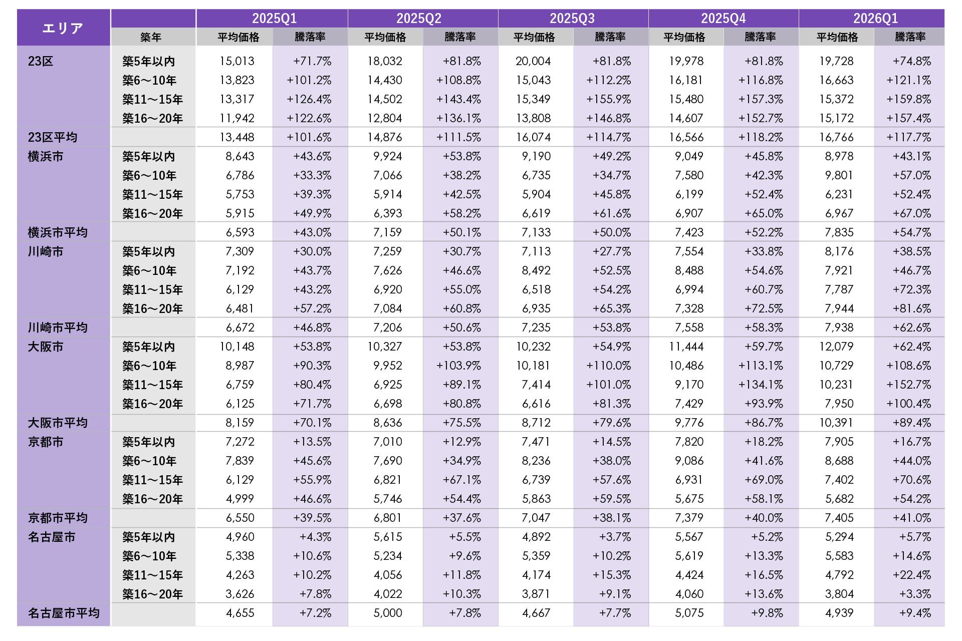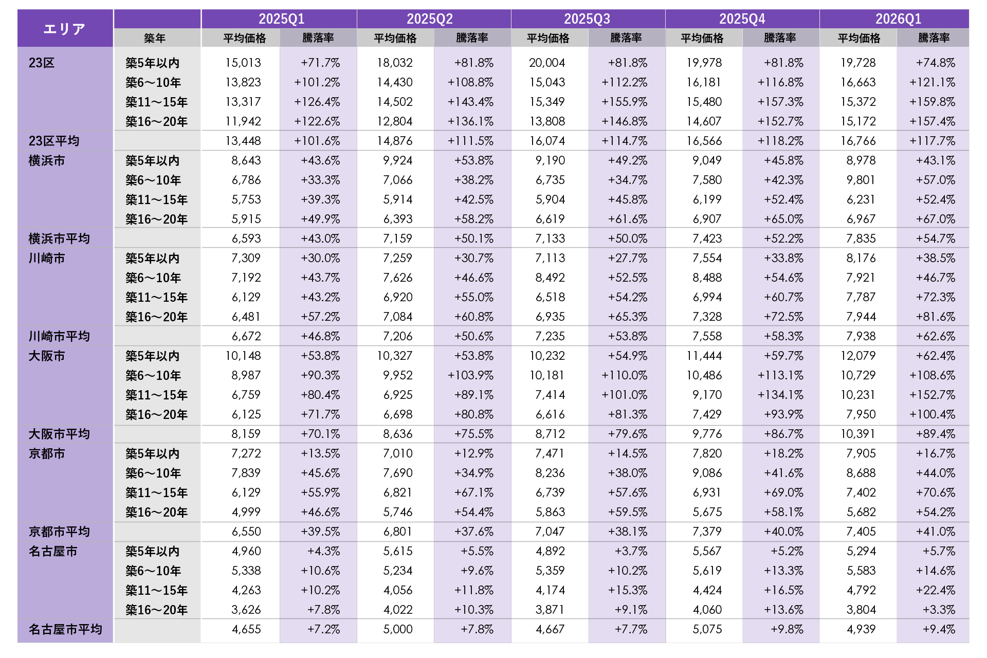 前年同期(2025年1~3月)比で平均価格が最も上昇したのは東京23区、平均騰落率が最も上昇したのは大阪市でした。