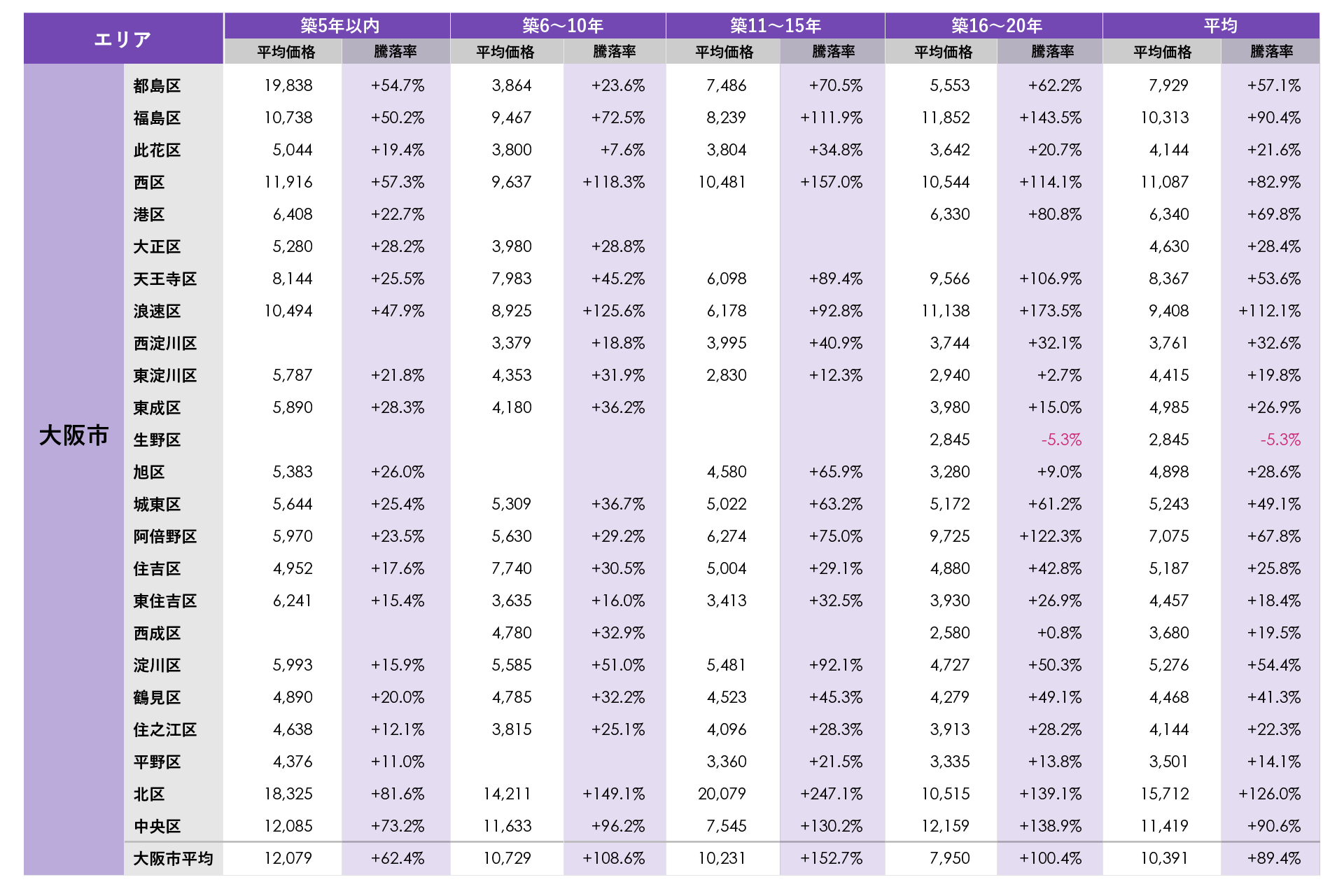大阪市で平均価格が最も高かったのは北区の1億5,712万円で、福島区、西区、北区、中央区の4区で平均価格が1億円を上回りました。平均騰落率も北区が新築分譲時プラス126.0%で最も高く、次いで浪速区が111.2%となり、この2区の平均騰落率がプラス100%(新築時価格の2倍)を超えました。築年別の平均騰落率では、福島区の築11~15年、築16~20年、西区の築6~10年、築11~15年、築16~20年、天王寺区の築16~20年、浪速区の築6~10年、築16~20年、阿倍野区の築16~20年、北区の築6~10年、築11~15年、築16~20年、中央区の築11~15年、築16~20年で平均騰落率がプラス100%(新築時価格の2倍)を上回りました。最も騰落率が高かった北区の築11~15年のプラス247.5%(新築時価格の約3.5倍)は築年数別で最も高かった東京都千代田区の築16~20年のプラス254.1%(新築時価格の約3.5倍)に次ぐ高い騰落率になっています。