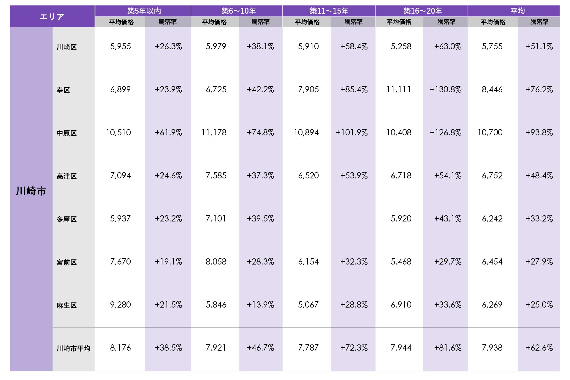 川崎市では、中原区が平均価格1億700万円で最も高く、市内で唯一平均価格が1億円を超えました。また中原区では全ての築年数帯で平均価格が1億円を上回っています。平均騰落率も中原区が最も高く新築分譲時プラス93.8%でした。築年数別の平均騰落率では幸区の築16~20年が130.8%で最も高く、中原区の築11~15年と築16~20年で平均騰落率100%(新築時価格の約2倍)を上回りました。武蔵小杉の大規模マンション、タワーマンションの価格が新築時価格を大きく上回り、相場をけん引しています。
