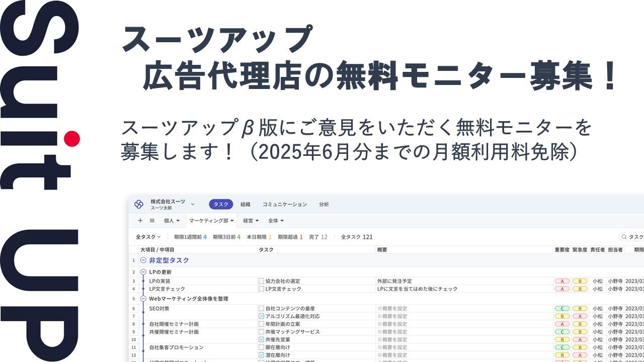 株式会社スーツ(所在地:東京都千代田区、代表取締役社長CEO:小松 裕介)は、チームでかんたん、チームのタスク管理・プロジェクト管理ツール「スーツアップ」において、広告代理店の無料モニターを募集いたします。