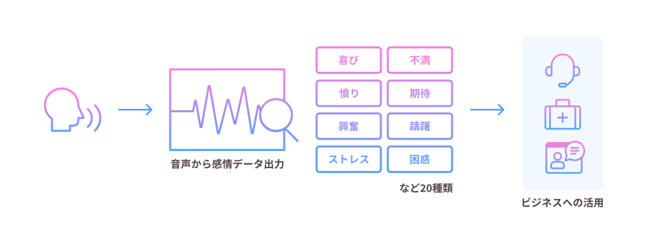 音声から話者の感情を解析し、喜び・憤り・ストレス・不満・期待など、20個のパラメータを約2秒に1回出力します。コンタクトセンターの顧客対応分析や、社員のメンタルヘルスケア、医療機関における診断などに活用可能です。