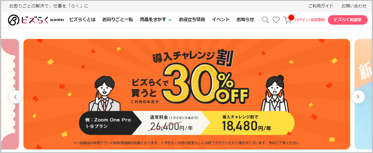 アスクル株式会社(本社:東京都江東区、代表取締役社長:吉岡晃)が運営するソリューション事業「ビズらく」は本日1月17日より、本サイトで取り扱うSaaS商品(※1)の年間プランを新規契約の場合、初年度価格が30%オフになるキャンペーン「導入チャレンジ割」を開始します。