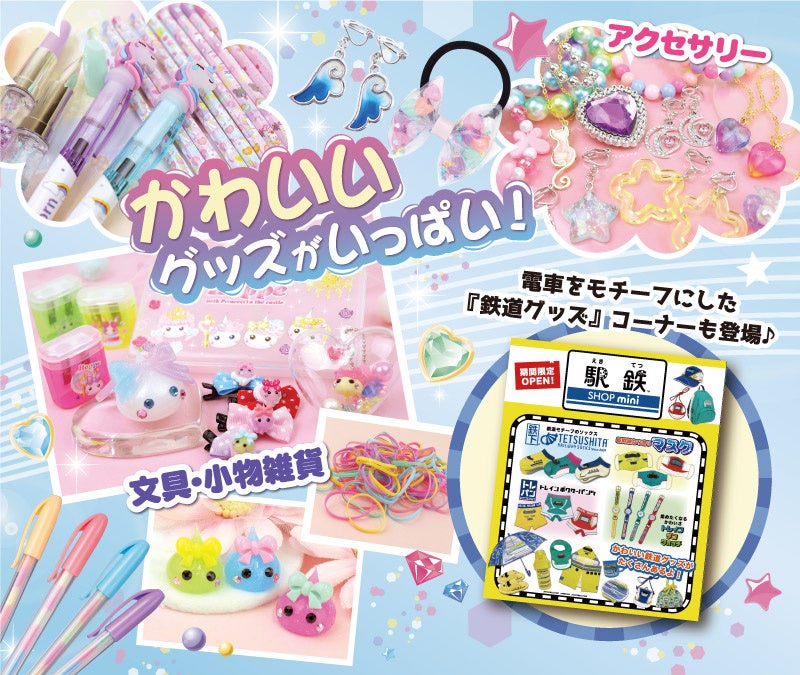 安くてかわいいアクセサリーや、文具・小物雑貨のほか、今回は「電車」をモチーフにした鉄道グッズコーナーも登場!「鉄下」(くつした)などワクワクするアイテムがいっぱいです♪