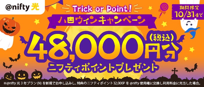 ニフティ、「@nifty光 3年プラン(N)」の新規申込で48,000円分(税込)のニフティポイントがもらえる「ハロウィンキャンペーン」を実施