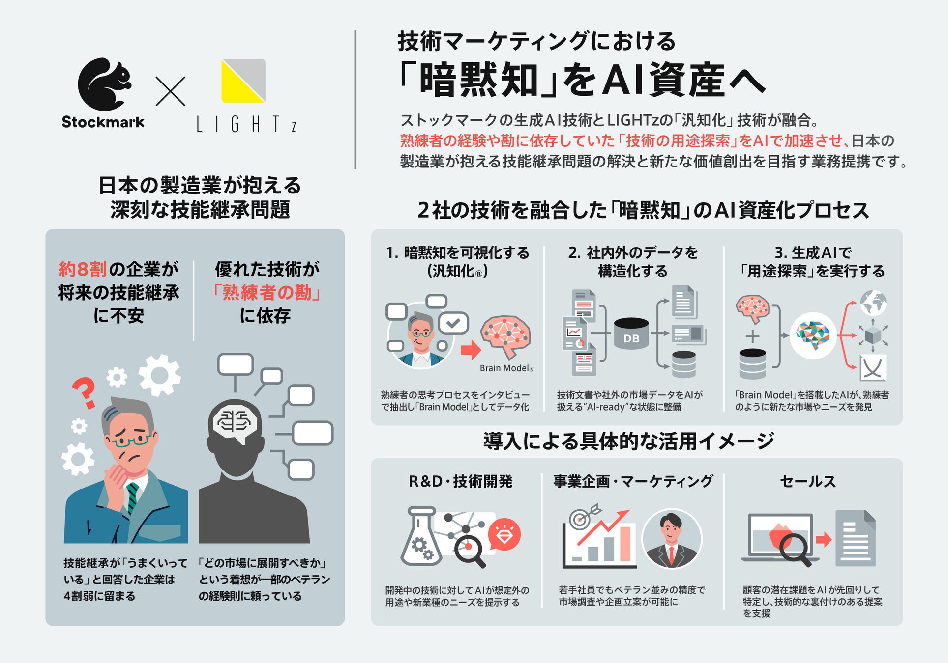 国産生成AI基盤の独自開発や生成AIサービスを提供するストックマーク株式会社(本社:東京都港区、代表取締役CEO:林 達、以下「当社」)は、熟練者の暗黙知の可視化、AI化技術(「汎知化®」)を持つ株式会社LIGHTz(本社:茨城県つくば市、代表取締役社長CEO:乙部 信吾、以下「LIGHTz社」)と、製造業の技術マーケティング/新規用途探索領域におけるソリューション強化を目指した業務提携を開始いたしました。