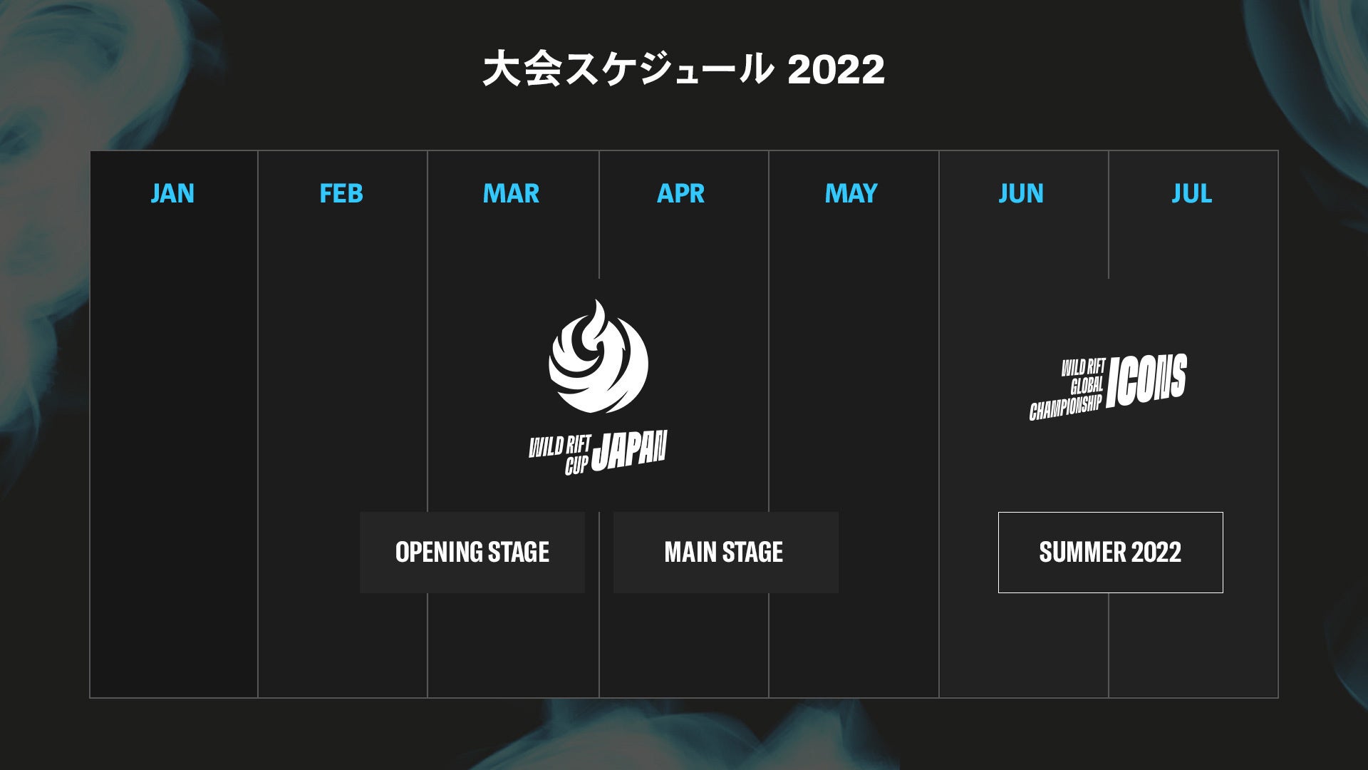「WJC: MAIN STAGE」は、3月上旬に参加チームのエントリー受付を行い、4月2日(土)に開幕します。5月8日(日)に行われる決勝戦で「WJC2022」の優勝チームが決定します。優勝チームは、今夏にヨーロッパで開催される世界大会「Wild Rift Icons Global Championship」のグループステージへの出場権、準優勝チームは同大会のプレイイン(予選トーナメント)への出場権を獲得します。