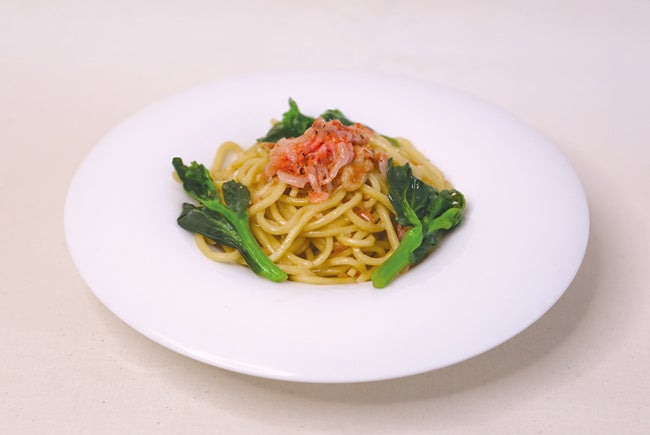 春の桜をイメージした桜エビと菜の花のペペロンチーノ。