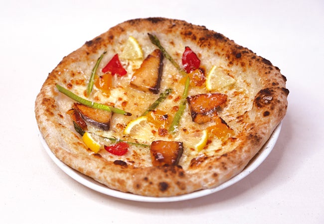 春から夏にかけて変化する爽やかな季節の空気をイメージした、サワラの自家製カルピオーネ(北イタリア風エスカベッシュ)、アスパラガス、タイムを使ったチーズベースの本格薪窯焼きピッツァ。