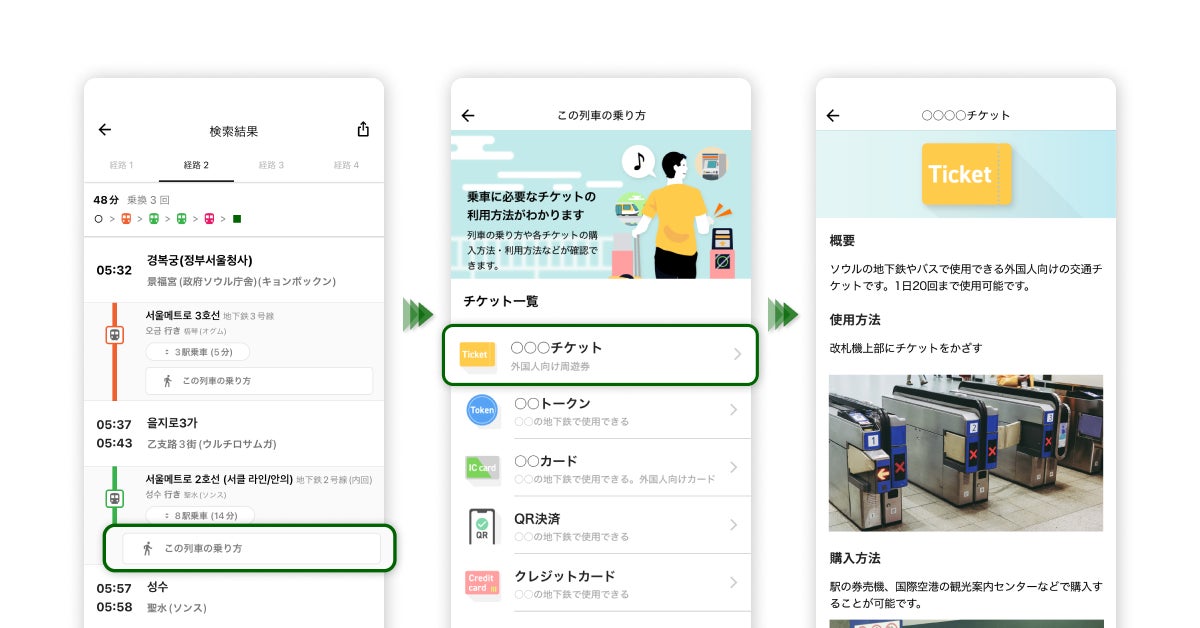今回の機能は、ルート検索結果画面にて、使用できる乗車券情報(ICカード、クレジットカード、切符など)とその利用方法/購入方法の情報を路線ごとに確認できる機能です。さらに、オンライン上で購入できる乗車券等がある場合、予約サービスの「Klook」経由で購入することも可能です。