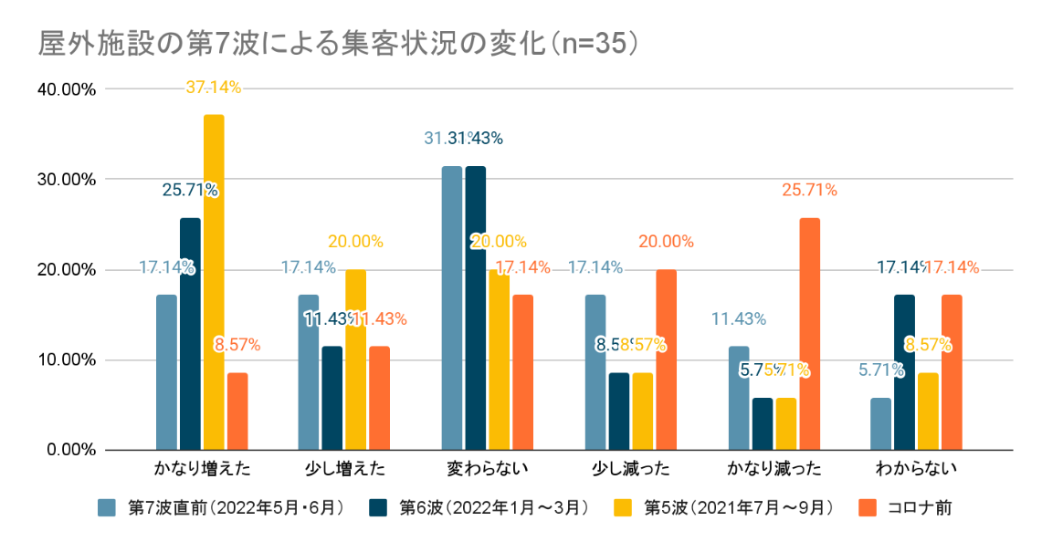 第6波と比べた場合においても、第7波直前比較と同様に「変わらない」がもっとも多くなりました。前述のとおり、第6波と第7波のコロナによる条件は同等。しかし、こちらも夏休みが重なった第7波時と寒くて屋外施設の利用者が減る時期と重なった第6波では、そもそもの来場者数の違いを鑑みると、実質的には「減った」と捉えている施設が多いのかもしれません。実際、2番目に多かった回答が「かなり増えた」となっているのは、時期の違いから、来場者数が「かなり増えた」と考えられます。