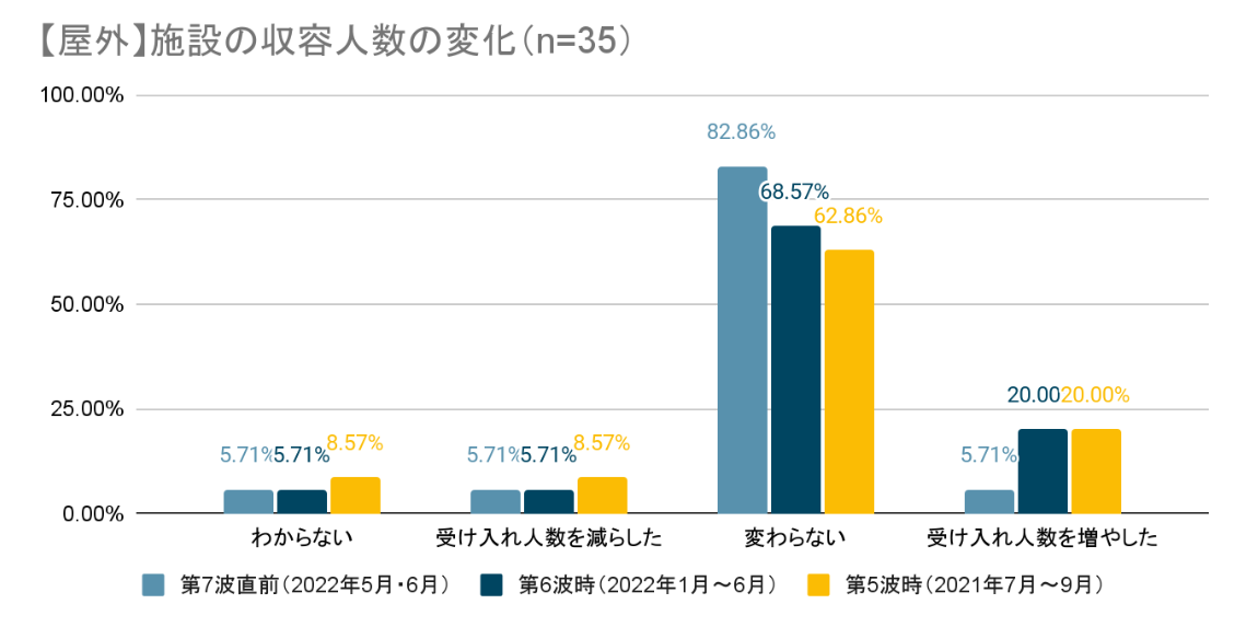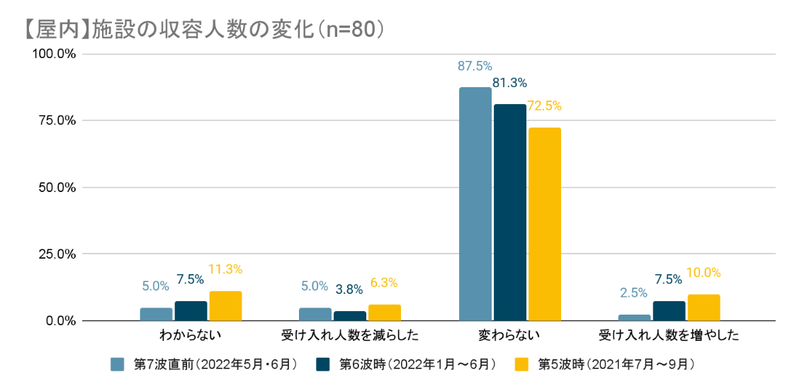 一部の施設では「第6波時」や「第5波時」に比べると受け入れ人数を増やした(人数制限を緩和した)というところもあるようですが、減らした(人数制限を強化した)という施設は少数のようです。