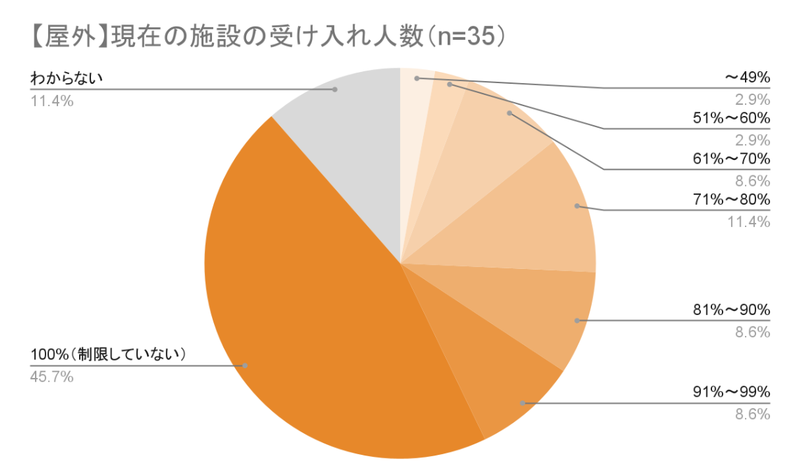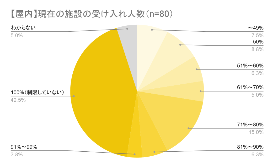 最後に、施設の受け入れ人数についても調査しました。一時は、ほとんどの施設が人数制限をおこない受け入れ人数を減らしていましたが、現状はどうなっているのでしょうか。こちらも屋内・屋外に分けて見ていきます。
