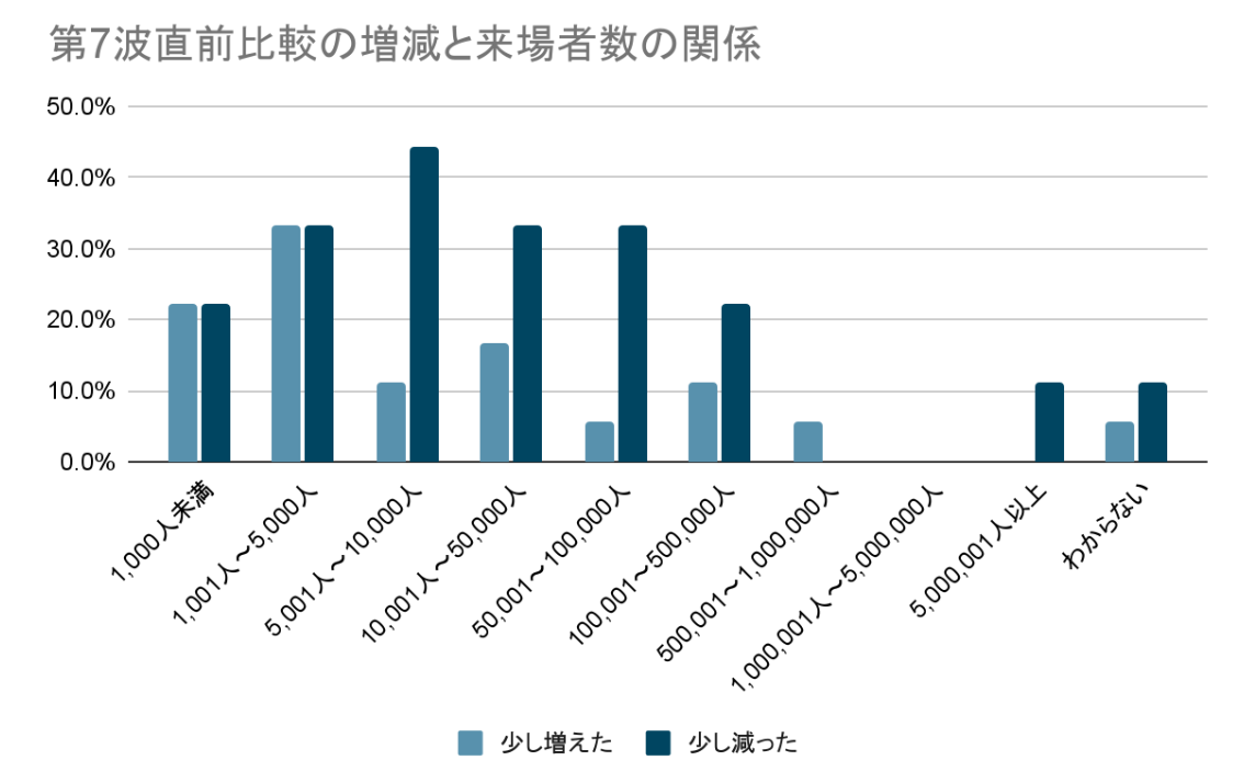 すると、「少し増えた」と回答した施設は年間来場者数が5,000人以下の施設に多く、「少し減った」と回答した施設は5,001人以上の施設が多くあったことがわかりました。つまり、第7波が流行しているとはいえ夏休みなので遊びに出かけた家族は一定数いたが、多くの人が集まるであろう大型施設への訪問は控え気味だったと考えられます。