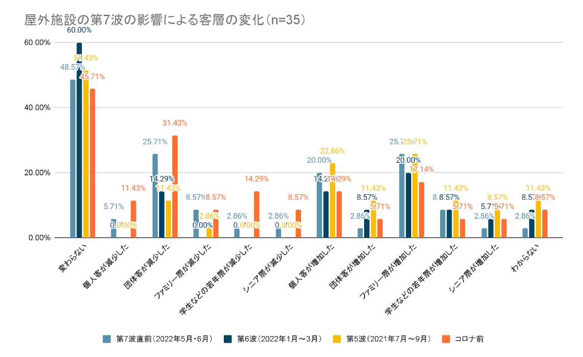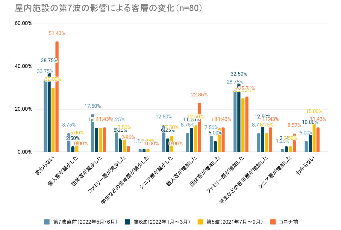どの時期と比較しても「変わらない」と回答した施設がもっとも多くなったものの、2番目に多くなったのは「ファミリー層が増加した」という回答でした。これは第7波が夏休み時期だったことから、直前や第6波よりファミリー層が増えたと考えられます。また、昨年の第5波時と比べて、ファミリー層が増えたというのは集客自体が増えたということではないでしょうか。