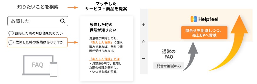 「Helpfeel」はカスタマーサポート業務の効率化に留まらず、ユーザーの検索を起点に新たなサービス・商品の提案が可能です。FAQの検索行動から顧客の潜在的なニーズを発掘し、そのニーズにマッチしたサービスや商品のWebページに自然な流れで誘導することで、売上の向上へ貢献します。