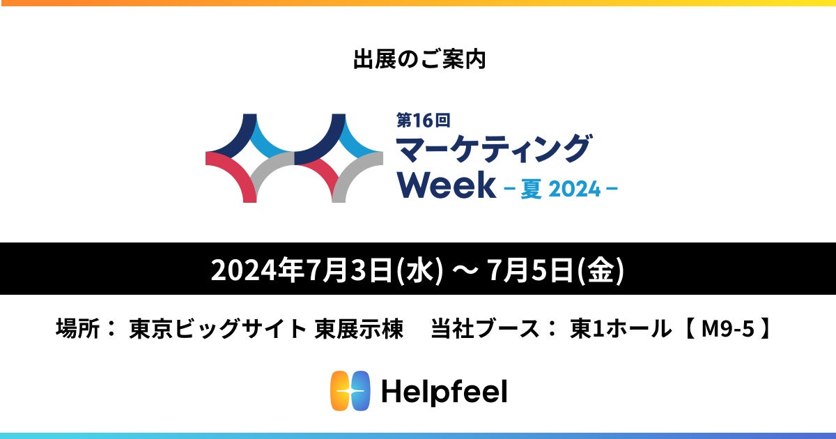 株式会社Helpfeel(京都府京都市、代表取締役/CEO:洛西 一周、以下 当社)は、2024年7月3日(水)〜7月5日(金)に東京ビッグサイトで開催される日本最大級のマーケティングの総合展示会「第16回 マーケティング Week - 夏 2024 -」に出展することをお知らせします。