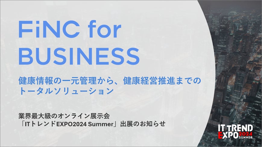 予防ヘルスケア×AI テクノロジー(人工知能)に特化したヘルステックカンパニーの株式会社 FiNC Technologies(本社:東京都千代田区、代表取締役 CEO 兼 CFO:小泉 泰郎、以下「当社」)が提供する「FiNC for BUSINESS」は、株式会社イノベーション(東証グロース 証券コード3970)のグループ会社である、株式会社Innovation & Co(本社:東京都渋谷区、代表取締役社長:齊藤和馬、以下「Innovation & Co」)が主催する業界最大級のオンライン展示会「ITトレンドEXPO2024 Summer」に出展します。