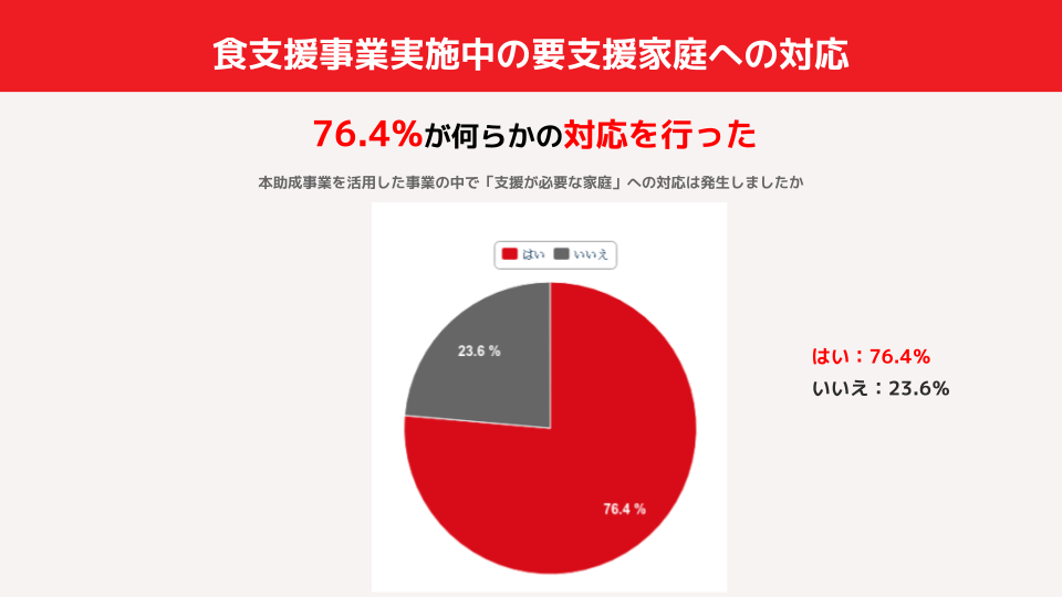 ・助成事業を活用した中で、76.4%の実施事業者が要支援家庭への対応を行っており、ひとり親家庭や経済的困窮家庭への支援が効果的に行われています。