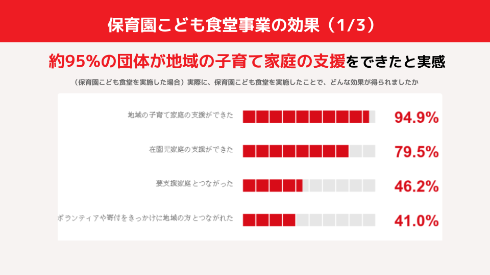 ・実施事業者の95%が、保育園こども食堂を通じて地域の子育て家庭の支援ができたと感じており、利用者アンケートでも育児支援への高い効果が認められました。