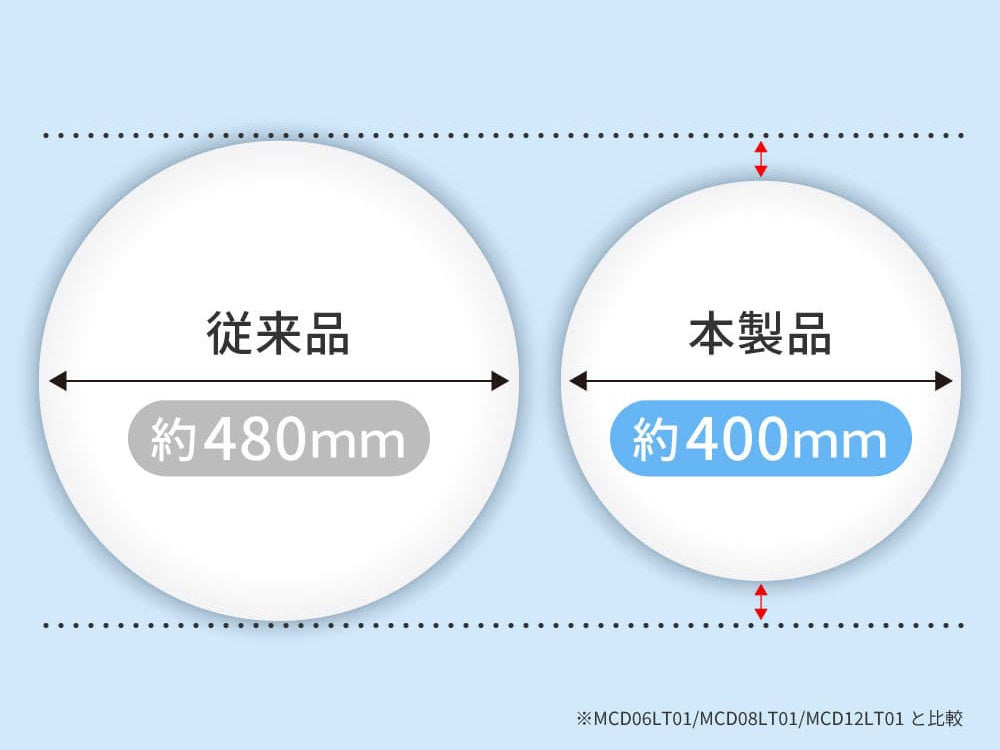 従来品から直径にして約80mmと、ひと回り小さくなり、コンパクトなサイズになりました。台所や廊下、狭いところでも使用することができます。