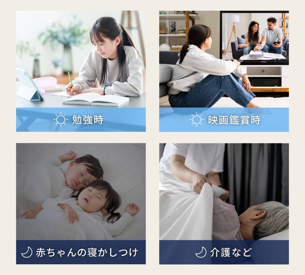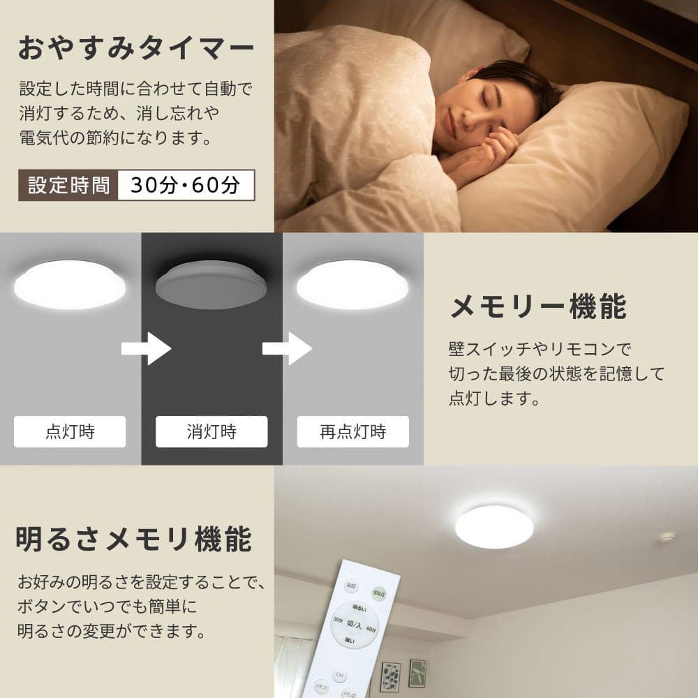 本製品には、消し忘れ防止の為のおやすみタイマー、直近の消灯時の状態を記憶して点灯時に再現するメモリー機能、いつでも自分の好みの明るさに変更できる明るさメモリ機能など便利な機能を搭載しております。