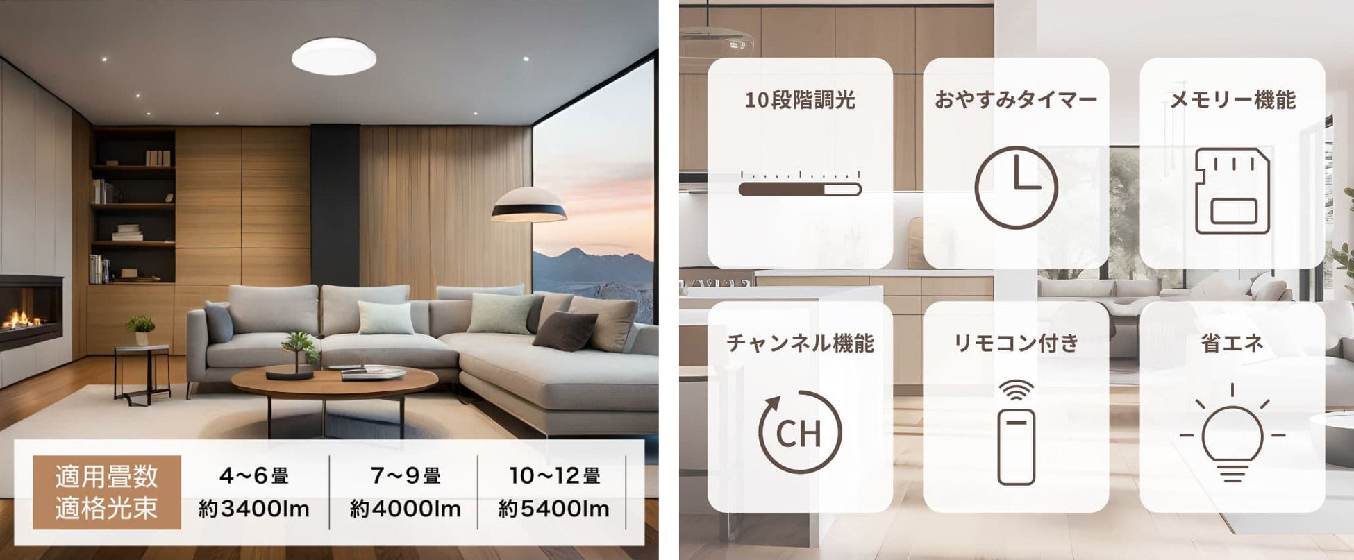 ・調光機能付きLEDシーリングライト(6畳~12畳用):https://maxzen.jp/product/mcd06-08-12lt02/