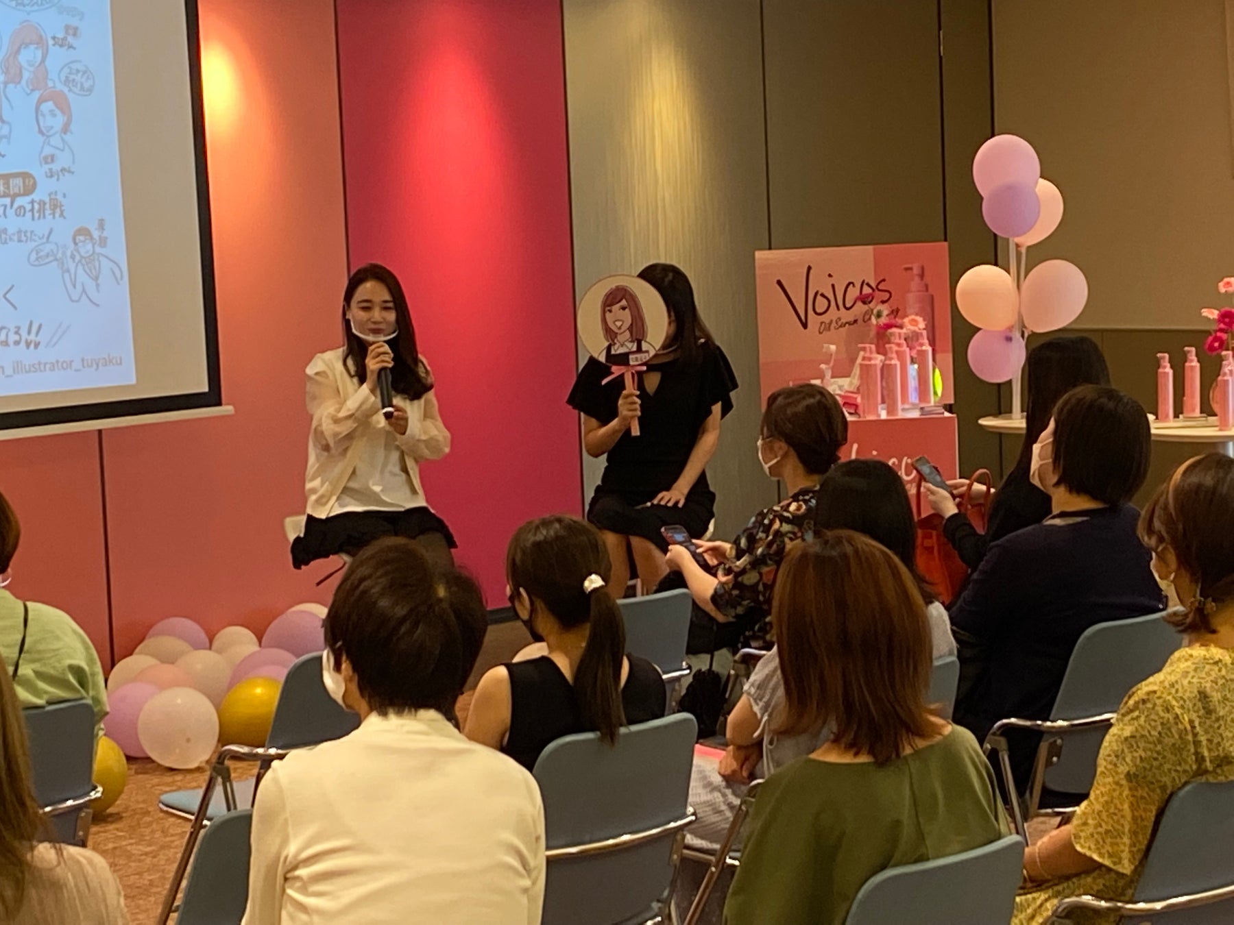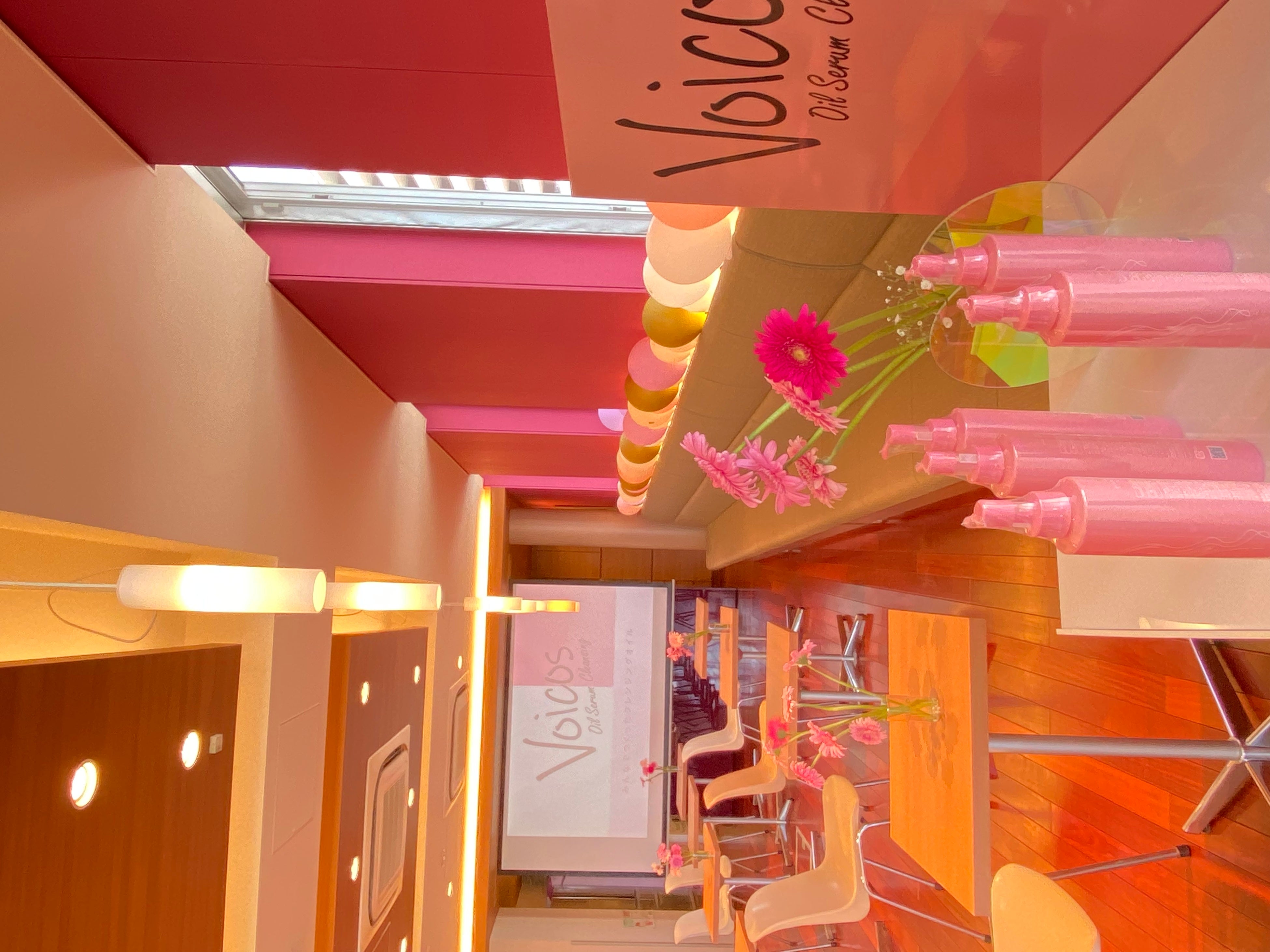 2022年7月23日(土)正午過ぎ、「Voicos(ヴォイコス)オイル セラム クレンジング 発売記念イベント」の会場である明色化粧品大阪本社へ、関西地方だけでなく、北海道や関東地方など日本各地から参加者が続々と会場入りしました。エントランスを彩るVoicos(ヴォイコス)カラーのバルーンを前にして参加者から大きな歓声があがり、撮影のためにポーズをとる姿が見られました。