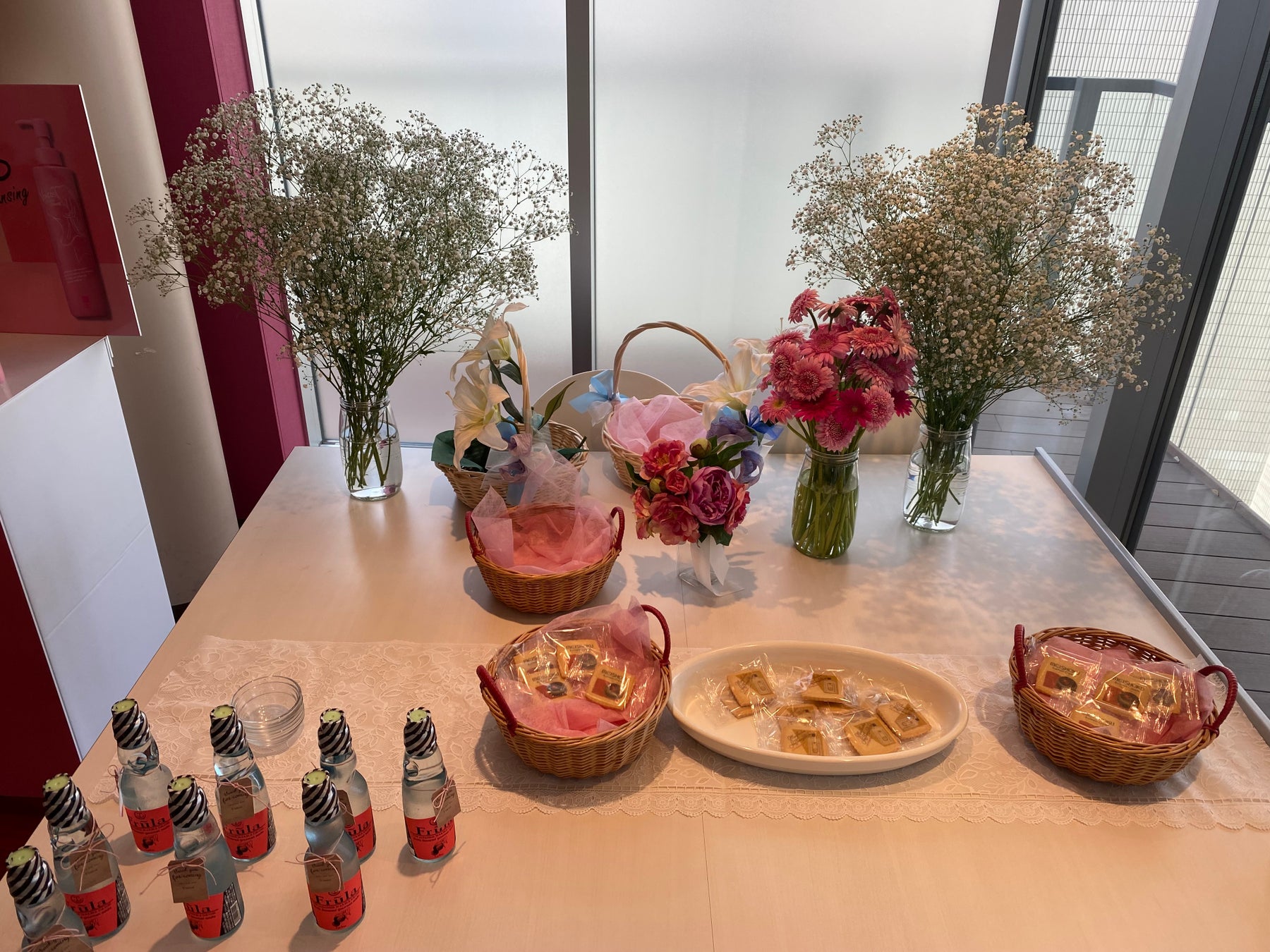 最後にスタッフが、明色化粧品商品の詰め合わせ、化粧品子氏の著書、会場を彩った花の一部をお土産として参加者に渡してお見送りをしました。