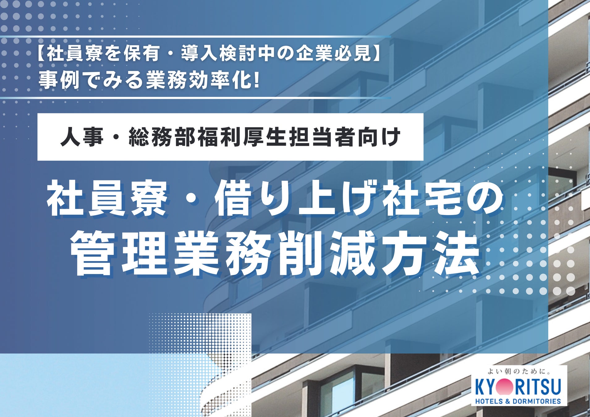 「ドーミー」の名称で全国500棟以上の学生寮・社員寮を展開する株式会社共立メンテナンス(以下、共立メンテナンス/代表取締役社長:中村 幸治/本社:東京都千代田区)は、社員寮・借り上げ社宅の管理業務に課題を抱える人事・総務部福利厚生担当者様に向けて、業務効率化を実現するホワイトペーパー「社員寮・借り上げ社宅の管理業務削減方法」を無料で公開しました。