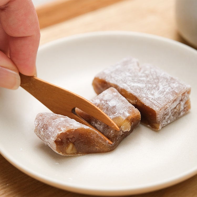 本商品は、たまり醤油でコクを引き出し、黒糖を使わずきび糖で仕上げた、やさしく素朴な甘じょっぱさが特長の和菓子です。濃厚な旨味ととろみのあるたまり醤油を用いることで、噛むほどに香りと甘みがふくらむ深みのある味わいに仕上げました。くるみの香ばしさともっちりした生地の弾力が心地よく重なります。
