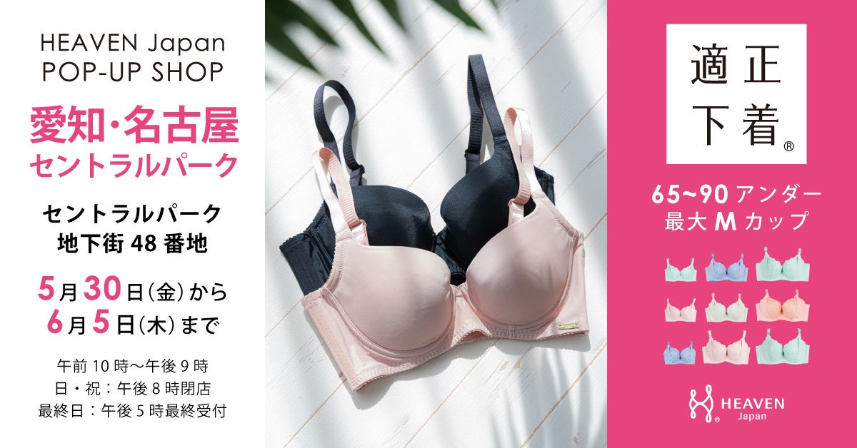 一人ひとりの女性の心と体に寄り添う「適正下着®」の開発から販売までを行う株式会社HEAVEN Japan(所在地:大阪府河内長野市、代表取締役:松田崇)は5月30日(金)〜6月5日(木)の期間中、名古屋・栄のセントラルパークにて、適正下着のフィッティング体験ができるポップアップショップを開催します。