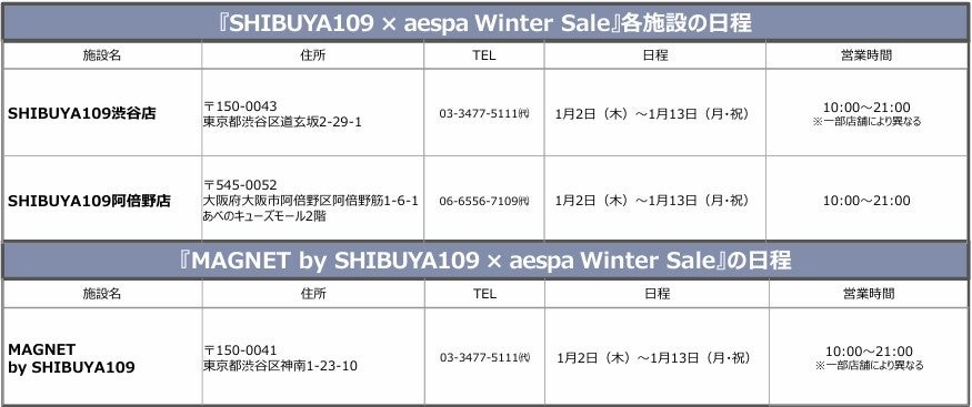株式会社SHIBUYA109エンタテイメント(本社:東京都渋谷区、代表取締役社長:石川あゆみ)は、東京・渋谷で運営する「SHIBUYA109渋谷店」「MAGNET by SHIBUYA109」、及び「SHIBUYA109阿倍野店」(大阪府大阪市)の3施設にて、2025年1月2日(木)~1月13日(月・祝)の期間、今年7月に日本デビューを果たした大人気グローバルグループ「aespa」(エスパ)をキャンペーンモデルに起用した『SHIBUYA109 × aespa Winter Sale』 『MAGNET by SHIBUYA109 × aespa Winter Sale』を開催いたします。