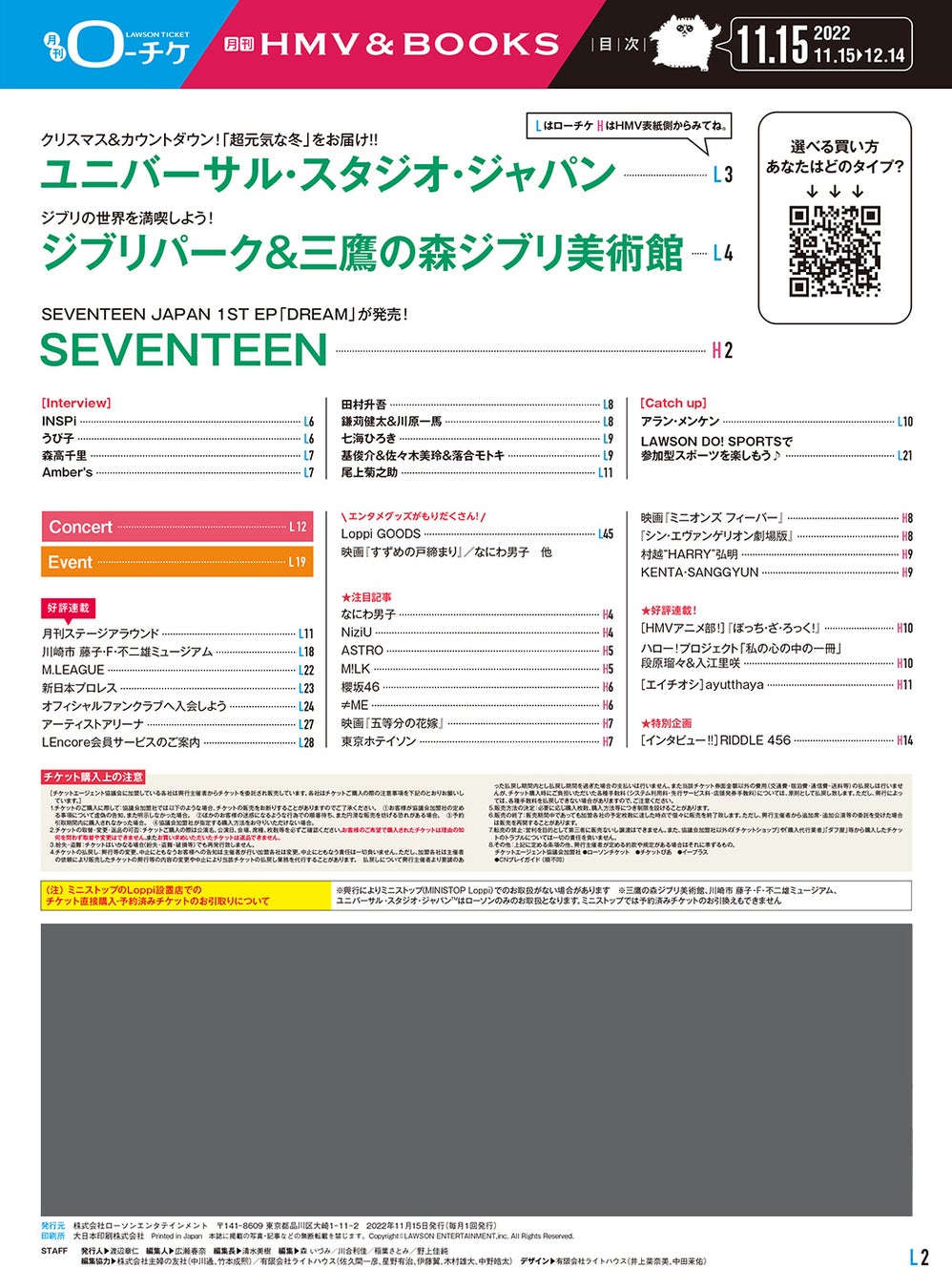 株式会社ローソンエンタテインメント(本社:東京都品川区、代表取締役社長:渡辺 章仁)が運営する「ローソンチケット」および「HMV&BOOKS」は、フリーペーパー『月刊ローチケ/月刊HMV&BOOKS』2022.11.15号を、11月15日(火)より、全国のローソンやHMVなどの店頭にて順次配布いたします。