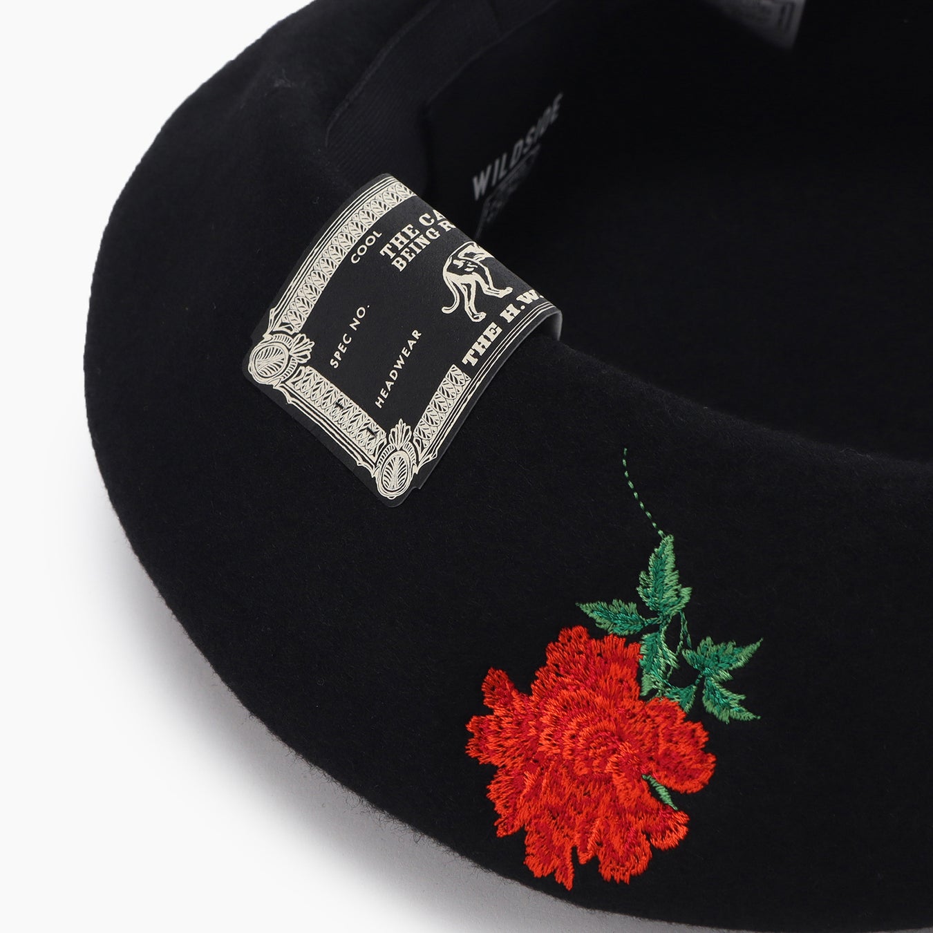 本コラボレーションではWILDSIDEエクスクルーシヴモデルとして、リアルな“牡丹”の花を刺繍で施したベレー帽が登場。ブランドのシンボルとなるペーパータグとホッチキス芯をオールブラックに変更しました。肉厚で密度もしっかりとしたウール100%の素材を使用し、通常のベーシックベレーより一回りサイズを大きくすることで、着帽した際にドレープが生まれる遊び心のあるアイテムとなっております。