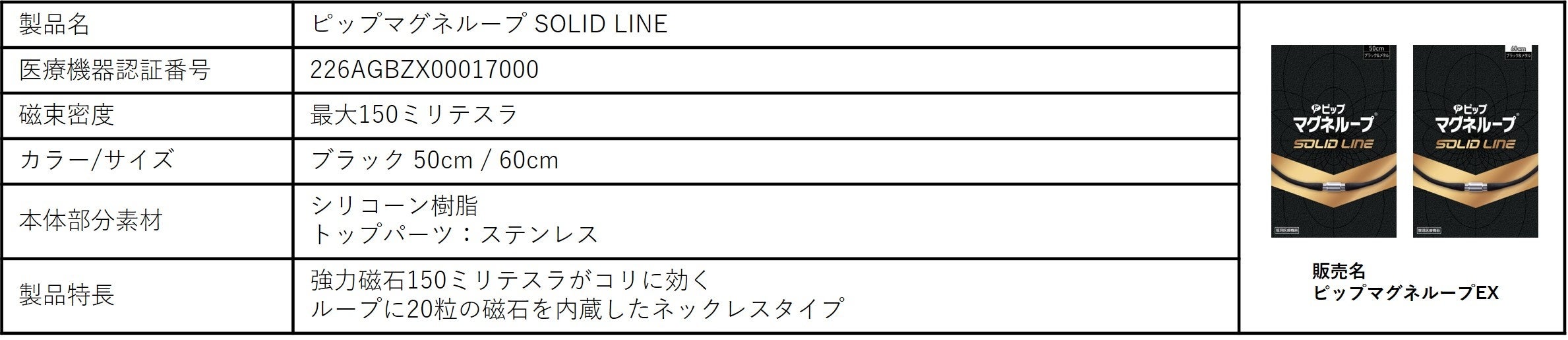 そのようなお客様の声から誕生した商品が、「ピップマグネループ SOLID LINE」です。ピップマグネループ SOLID LINEは、シンプルで洗練された上品な無垢ステンレスが輝くデザインで、より日常で使いやすく、おしゃれにコリケアをしたい男性にぴったりな商品です。