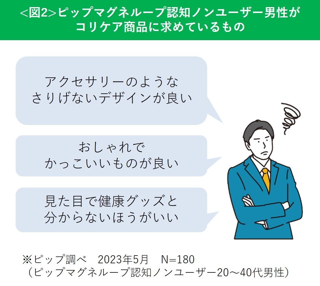 ピップマグネループシリーズは、市場の売上金額において前年比130%と二桁成長で好調に推移しています<図1> 。ピップマグネループ使用者数が増える中、ピップマグネループシリーズを知っていても使用したことがない男性がコリケア商品に求めているものとして、「アクセサリーのようなさりげないデザインが良い」「おしゃれでかっこいいものが良い」「見た目で健康グッズとわからないものが欲しい」という声が多く、使用に至っていない方がいらっしゃるのが現状です<図2> 。