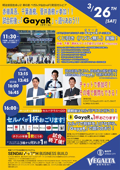 今回は、べガルダ仙台が参画した仙台市経済局主催、eiicon company運営の『SENDAI X-TECH BUSINESS BUILD』プログラムにおいて、株式会社GayaR(ガヤール)とのコラボが実現。リアルタイム実況アプリ「GayaR(ガヤール)」を使い、スタジアムの外で体験する新たなエンターテインメントサービスや、周辺店舗等との連携による、スタジアムから地域に波及する都市体験を提供します。
