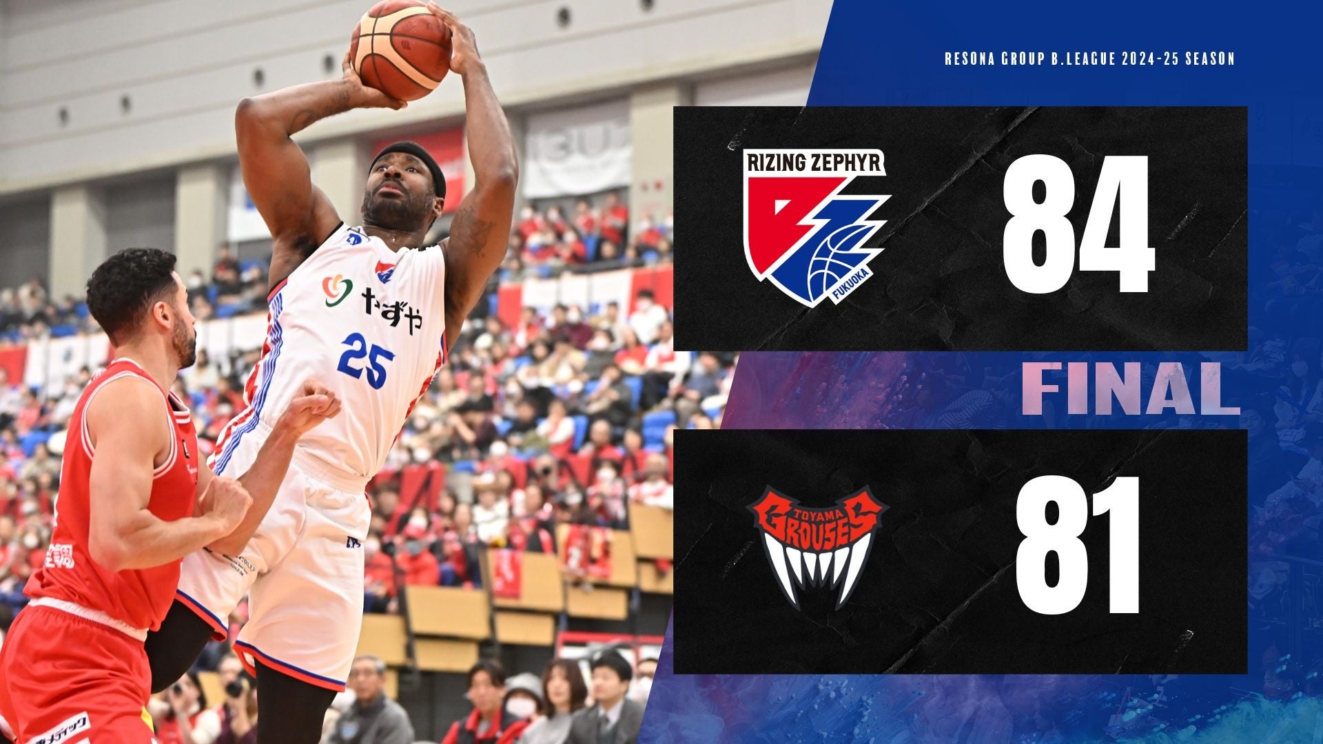 2024年12月15日(日)に開催されました、りそなグループB.LEAGUE 2024-25シーズン第12節【富山グラウジーズvs.ライジングゼファーフクオカ】の結果は、 “富山81-84福岡” 福岡の勝利となりましたことを、お知らせいたします。