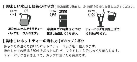 パッケージの裏面には美味しい水出し紅茶の淹れ方も記載。水出し紅茶初心者の方にもわかりやすい表記にしています。お好みでホットティーでも淹れることが可能です。